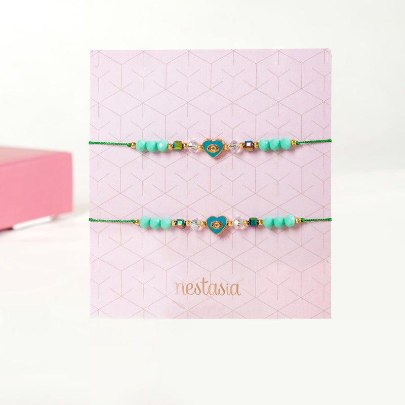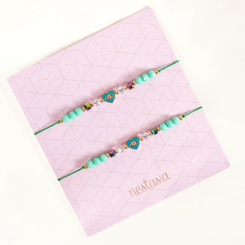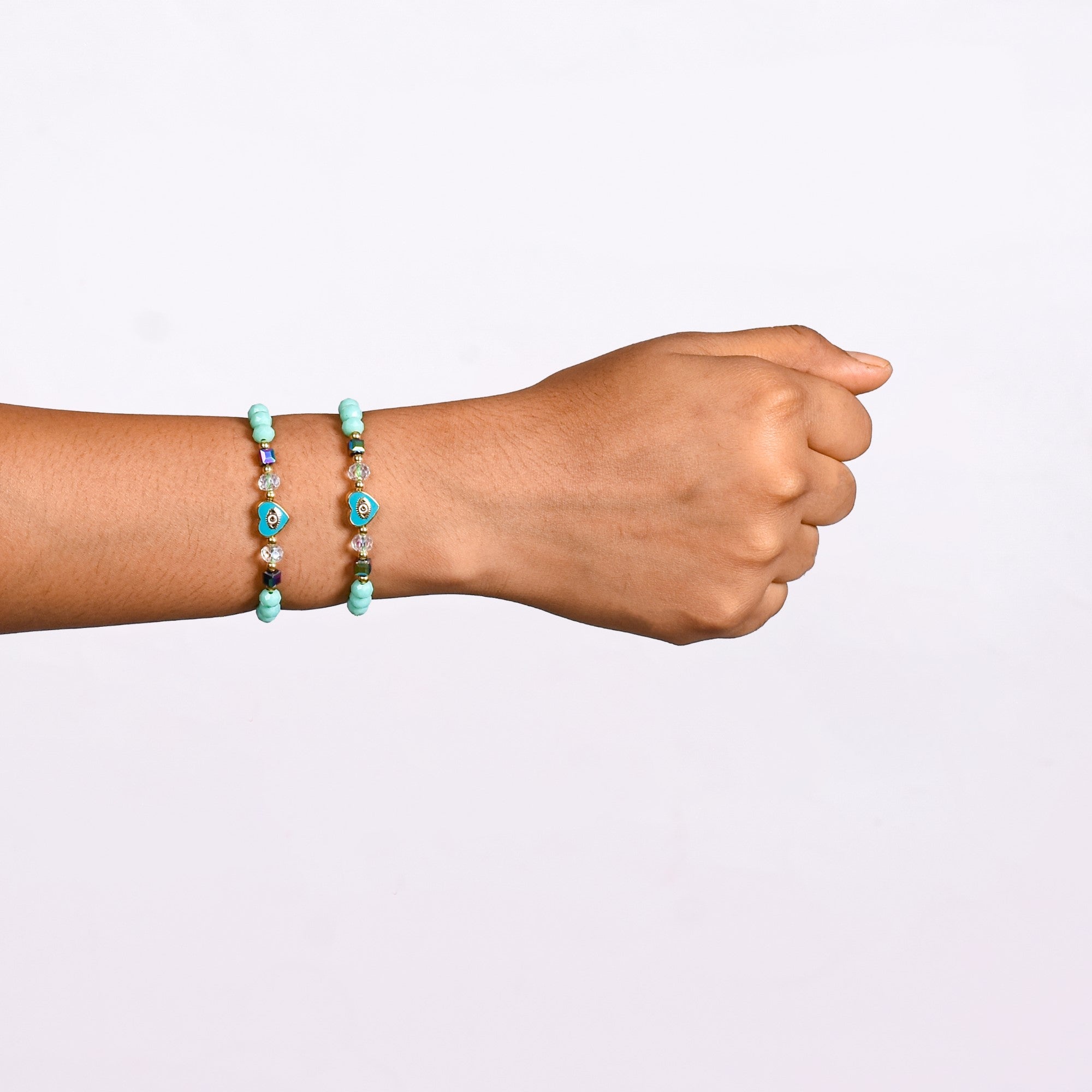 Add a pop of colour and charm to your day with this gorgeous bracelet set. Featuring a playful mix of beads in soft mint green hues, iridescent shines, and translucent tones, this piece brings a casual chic vibe to any outfit. The delicate heart charm is the centre of attention and rightfully so. Adorned with an opulent gold-coloured Hamsa eye set on a vibrant turquoise blue heart, this charm is a beautiful symbol of protection and the profound love you share with the receiver. This is the kind of fashion jewelry you’ll want to wear on repeat. Perfect for layering with other bracelets for women or letting it shine on its own, this bracelet pairs effortlessly with casual daytime looks or as a fun accent to your evening ensemble.