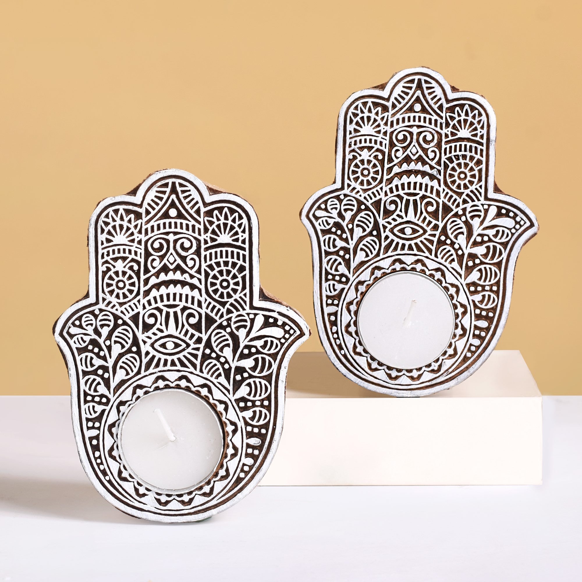 Set Of 2 Hamsa Hand Mango Wood Tea Light Holders |