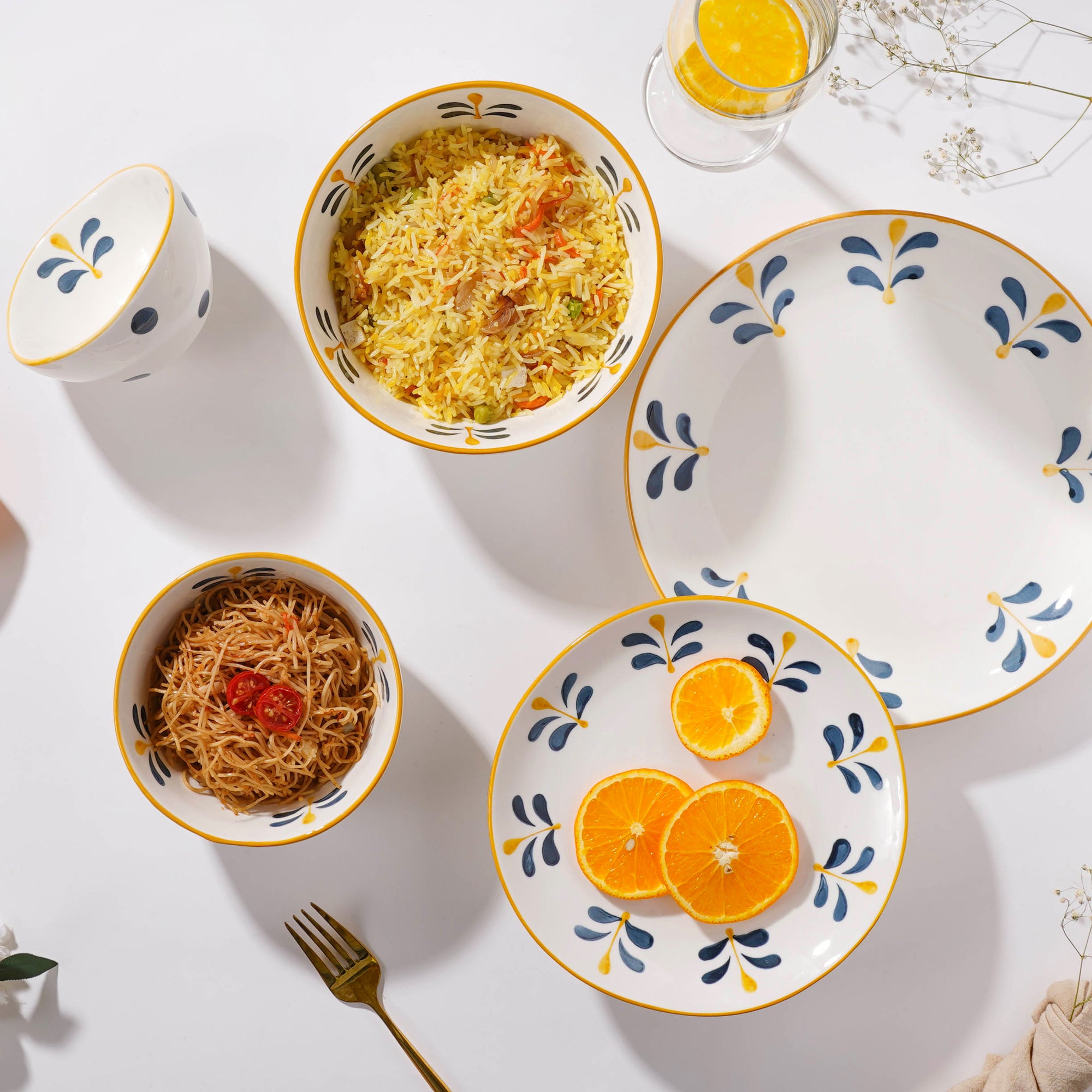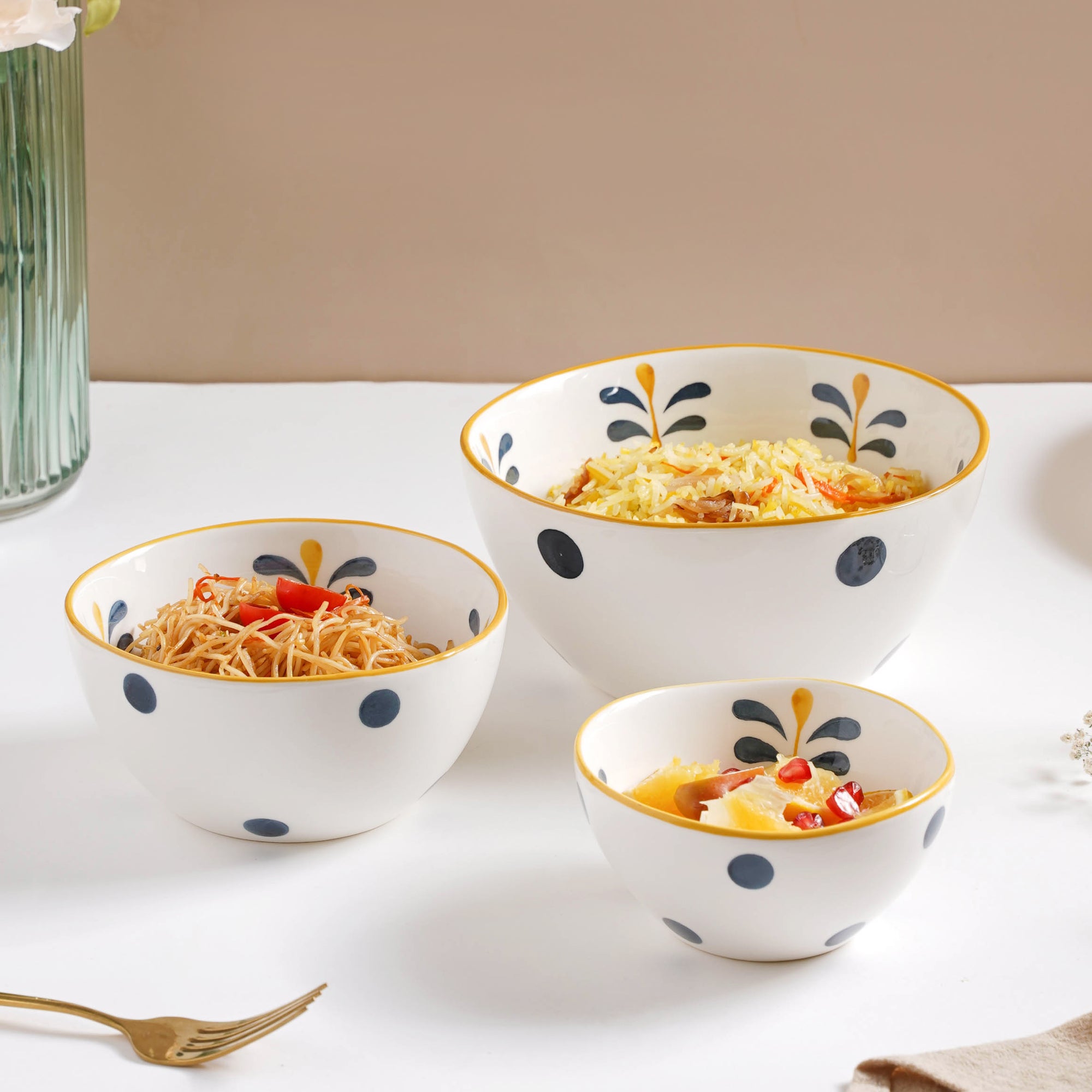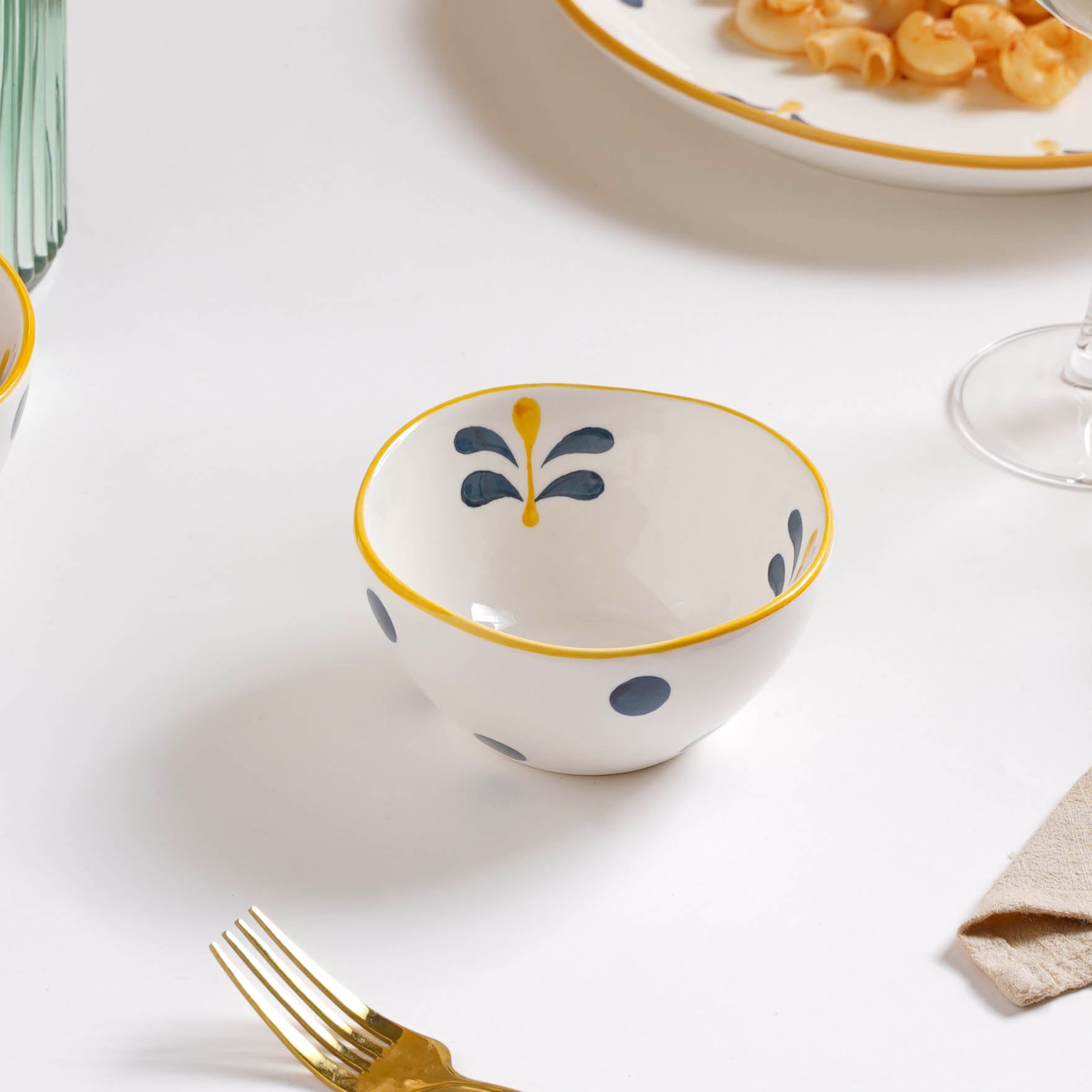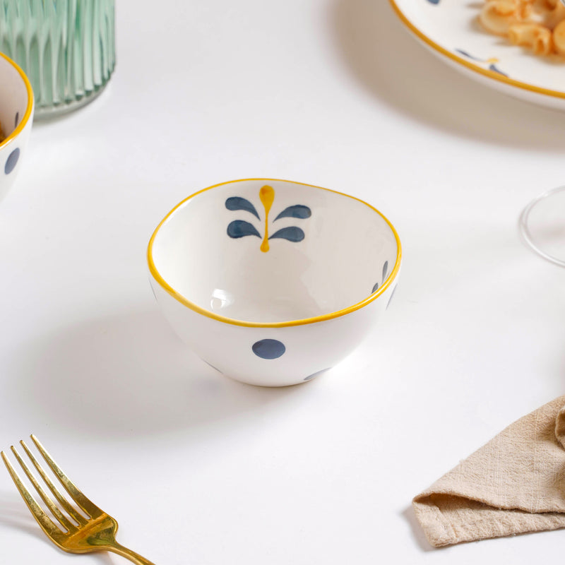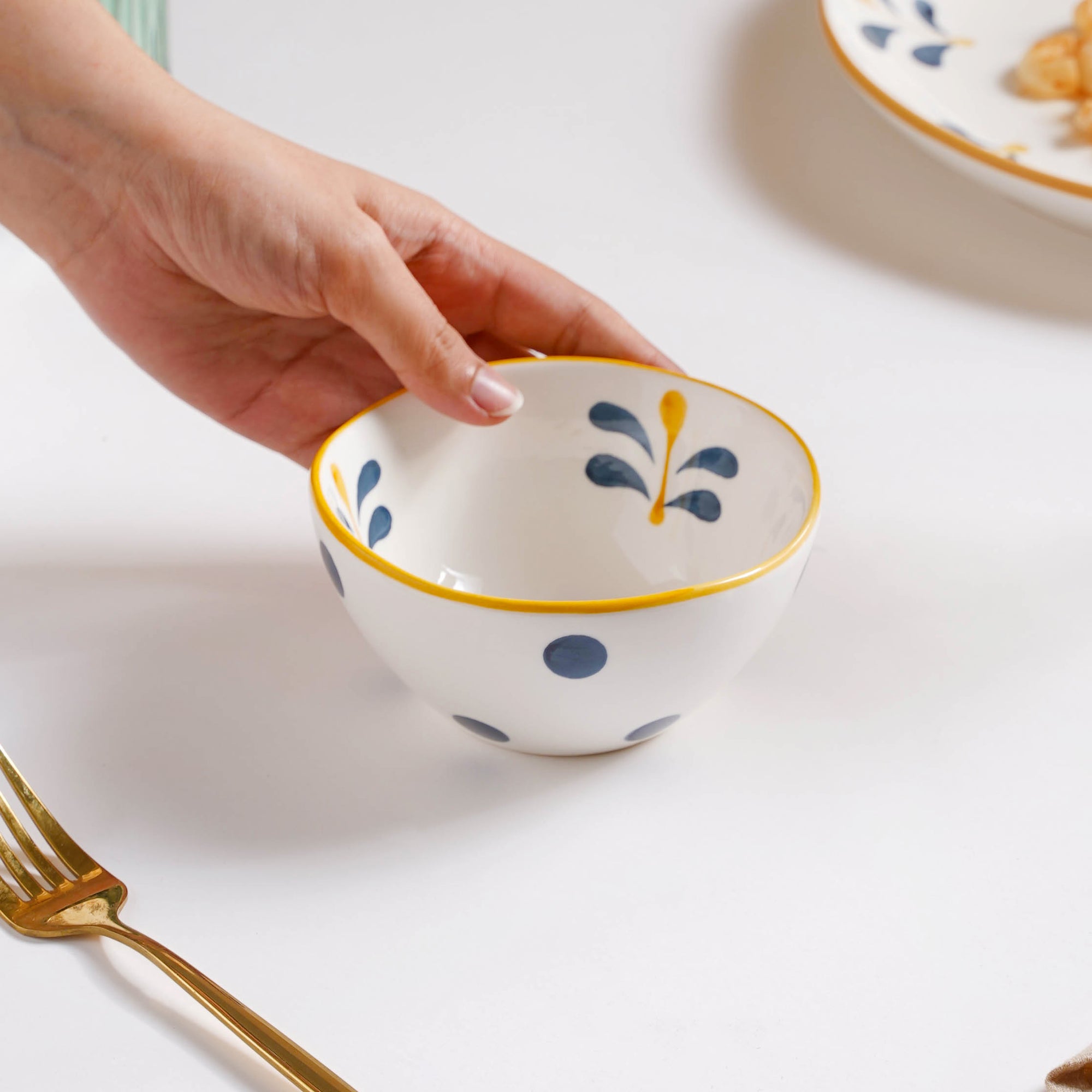 The minimal yet striking ceramic bowl is ideal for treating the guests to a bowl of delicious dessert after a scrumptious meal. The white ceramic bowl is ideal for serving pudding, ice cream, fruit custard, or any other side dish. One can serve lentils or any gravy dishes with the main course meals in this small ceramic bowl. The simple bowl is accentuated with blue polka dots on the outer surface and floral motifs on the inner part.