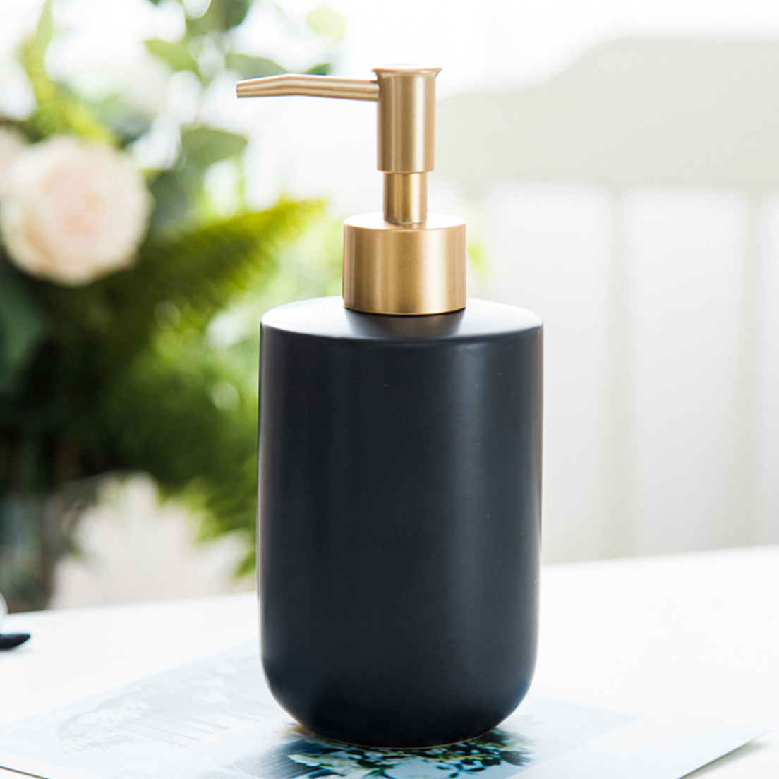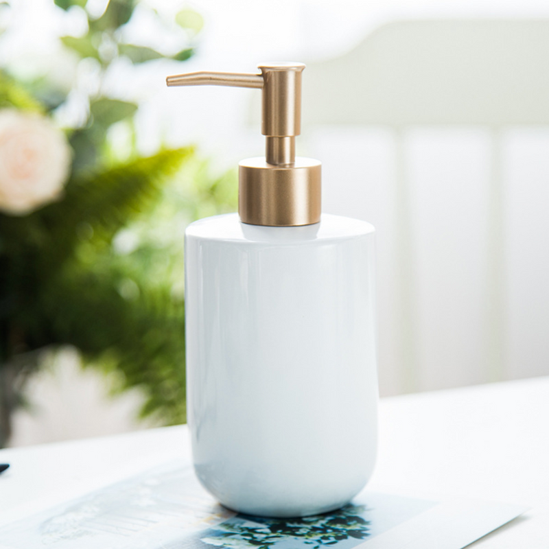 Hand wash dispenser bottle that comes in white and black with a gold dispenser pump. Use the liquid soap dispenser as a lotion bottle or a dispenser for body wash or as a shampoo dispenser. The soap dispenser bottle has a classic shape and comes in classic colours that can suit various bathroom accessories sets or bath settings. One can also use the ceramic dispenser for the kitchen or as a sanitizer dispenser bottle.
