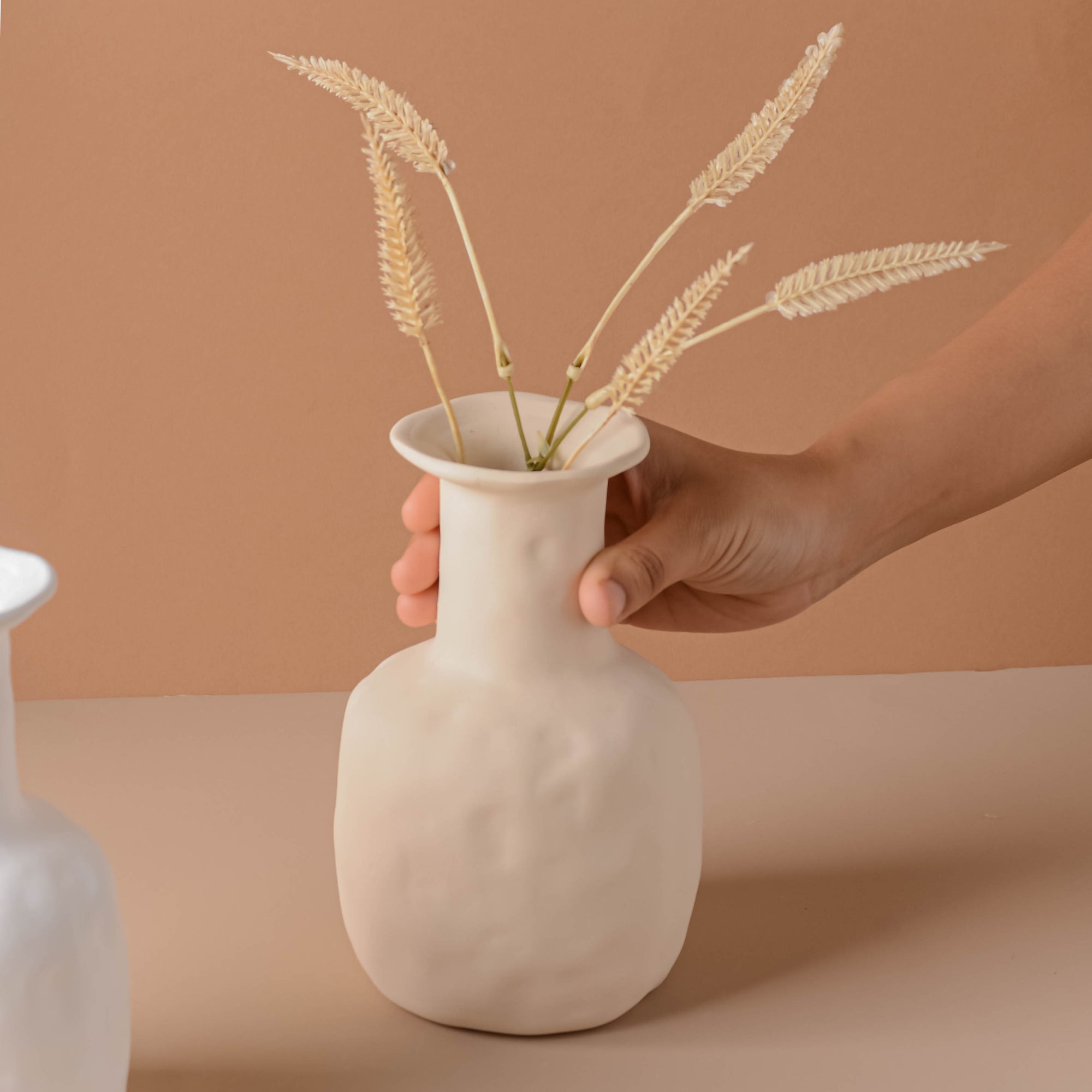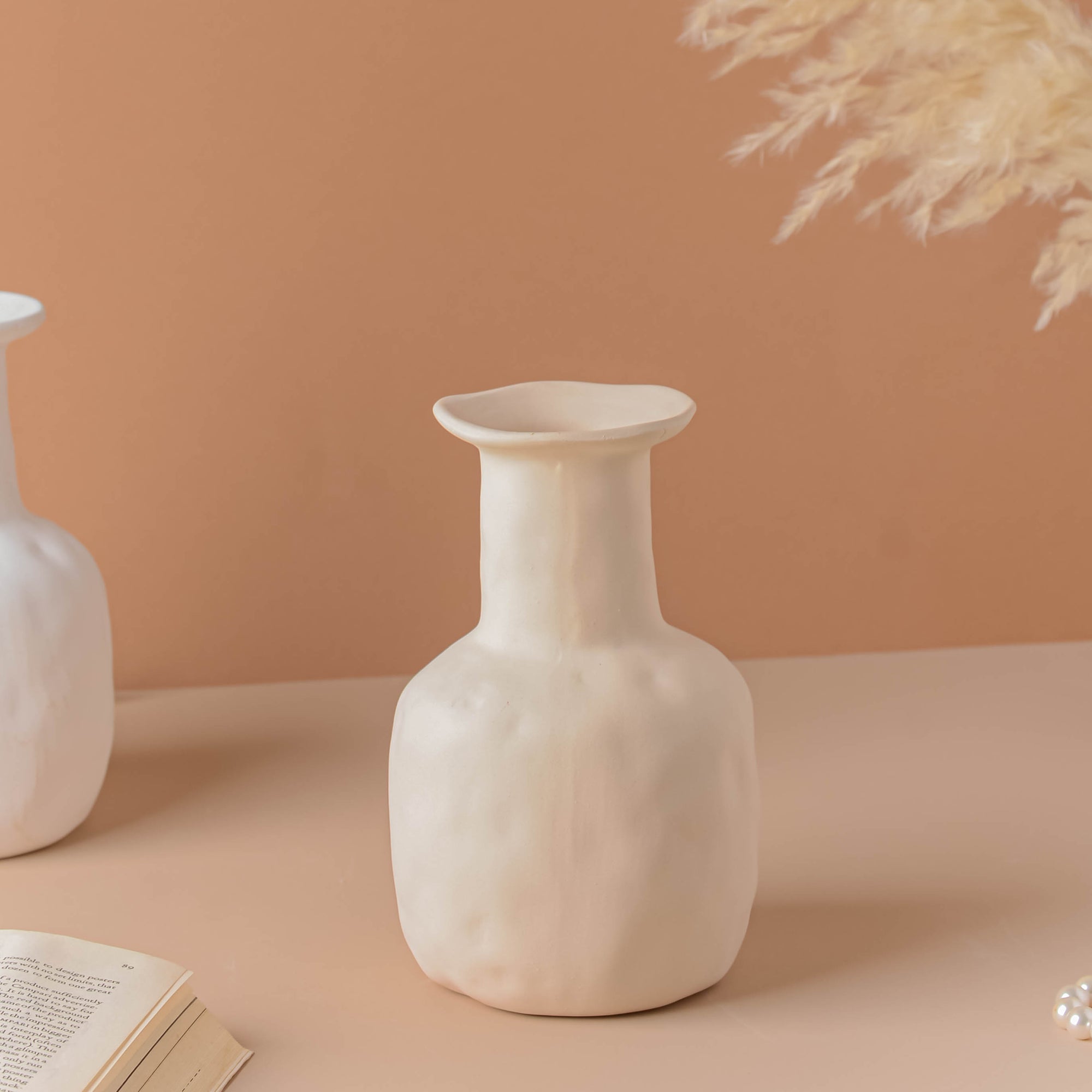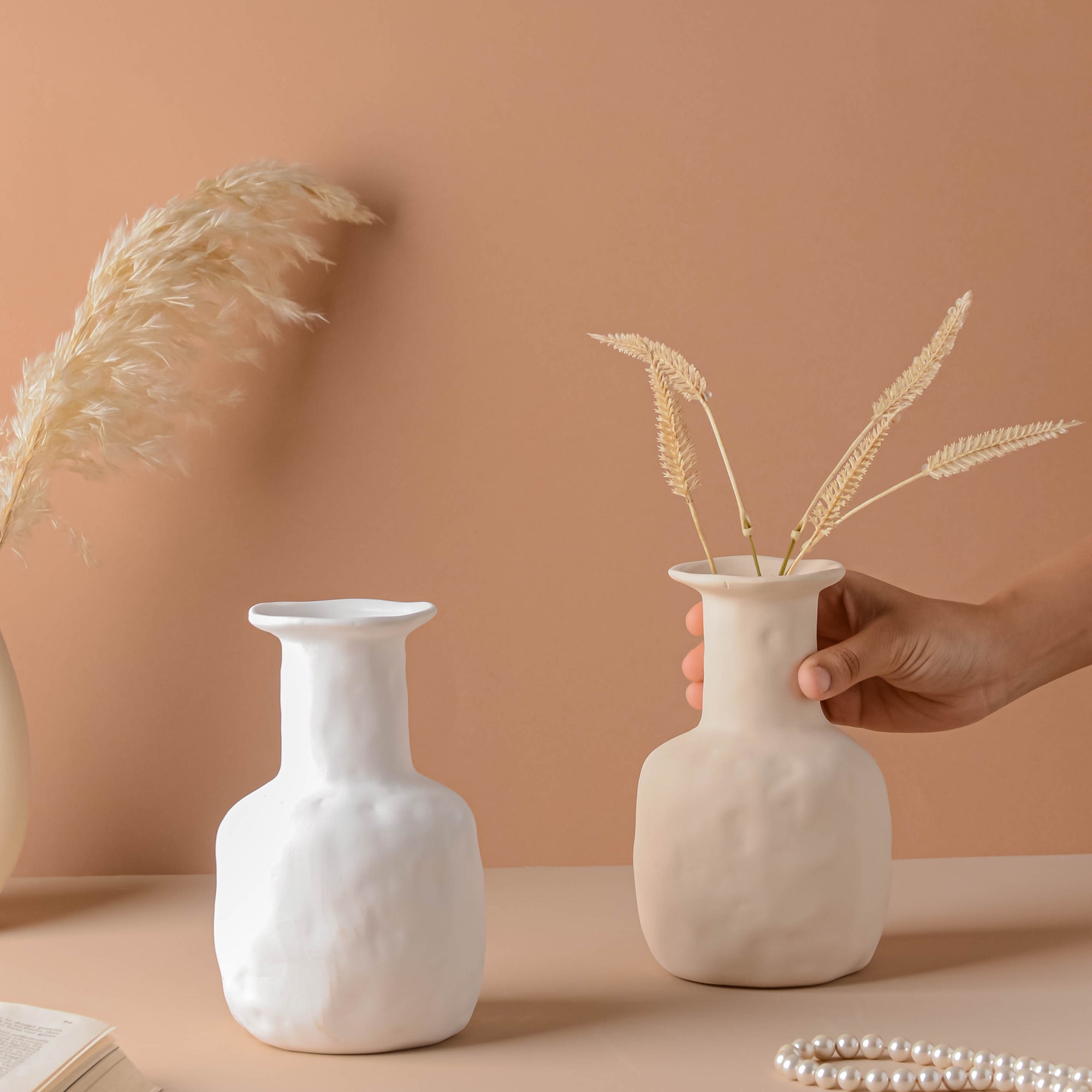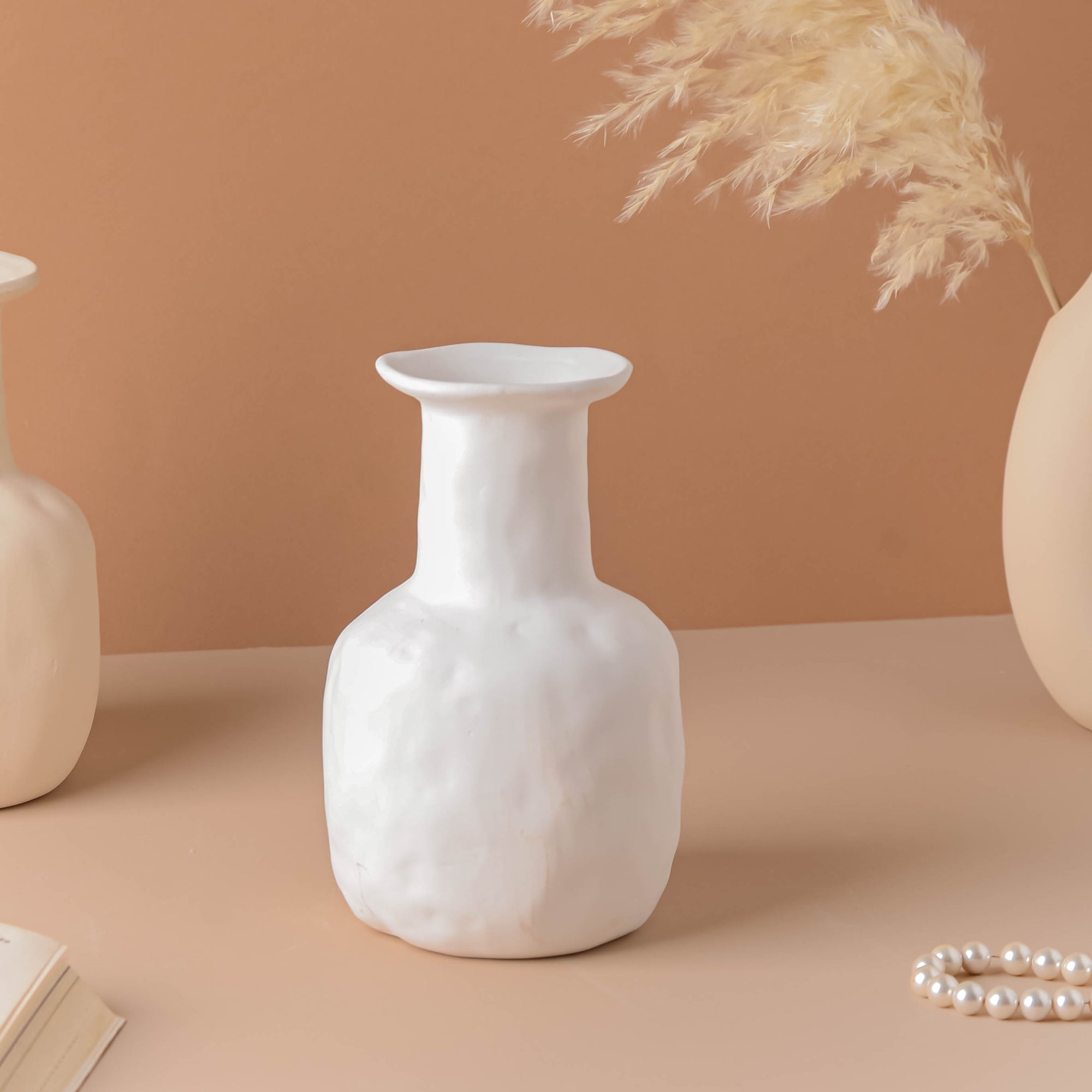 The textured vase with a narrow neck and wide base makes a wonderful accessory to bedeck one's home or office, its soft palette making it perfect for any space. The handcrafted vases have been molded with love and care and long hours of labor have been spent to bestow upon it the artistic forms and curves that make it so unique. The vase would truly pose as an upgrade for that shelf that looks dull and drab and needs a little bit of a fresh touch to sparkle up with color. The strength of this vase lies in its texture which is quite attention-grabbing and detailed. Using statement vases in white, especially one like this could also be a great step towards decluttering since the inclusion of statement pieces in one's decor can also mean doing away with too many unnecessary objects of decor.