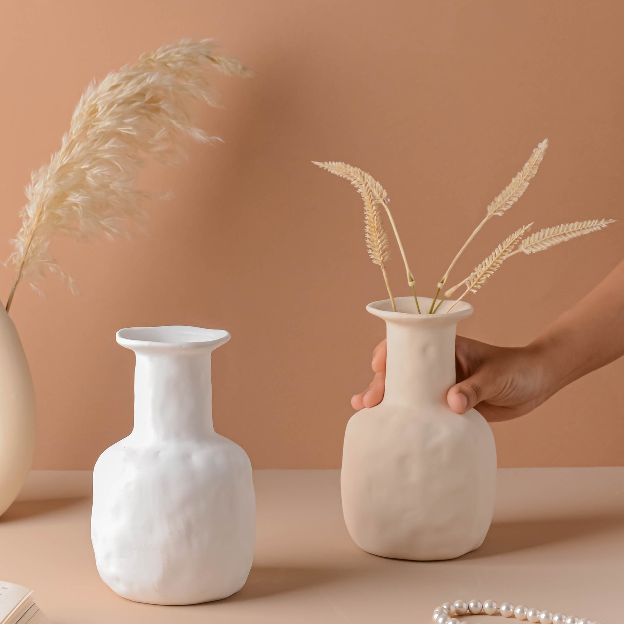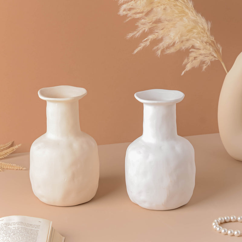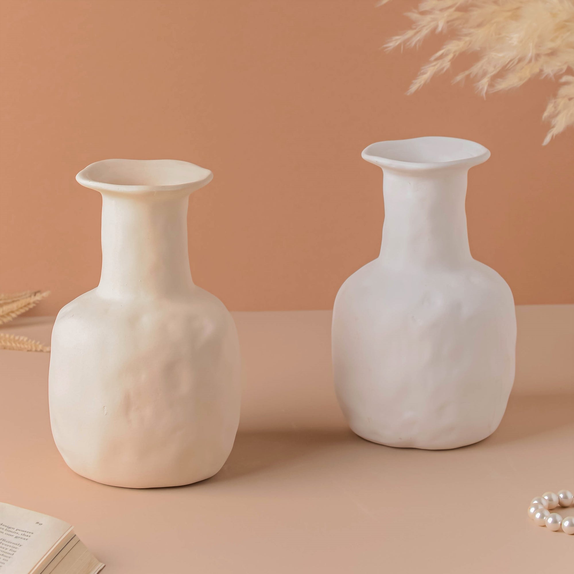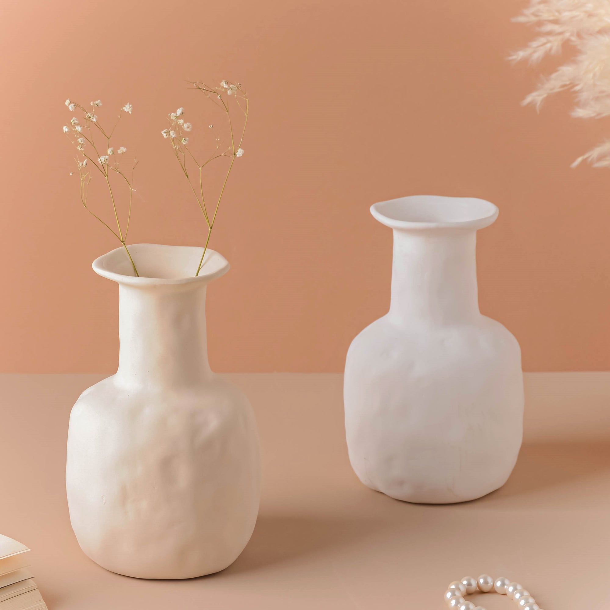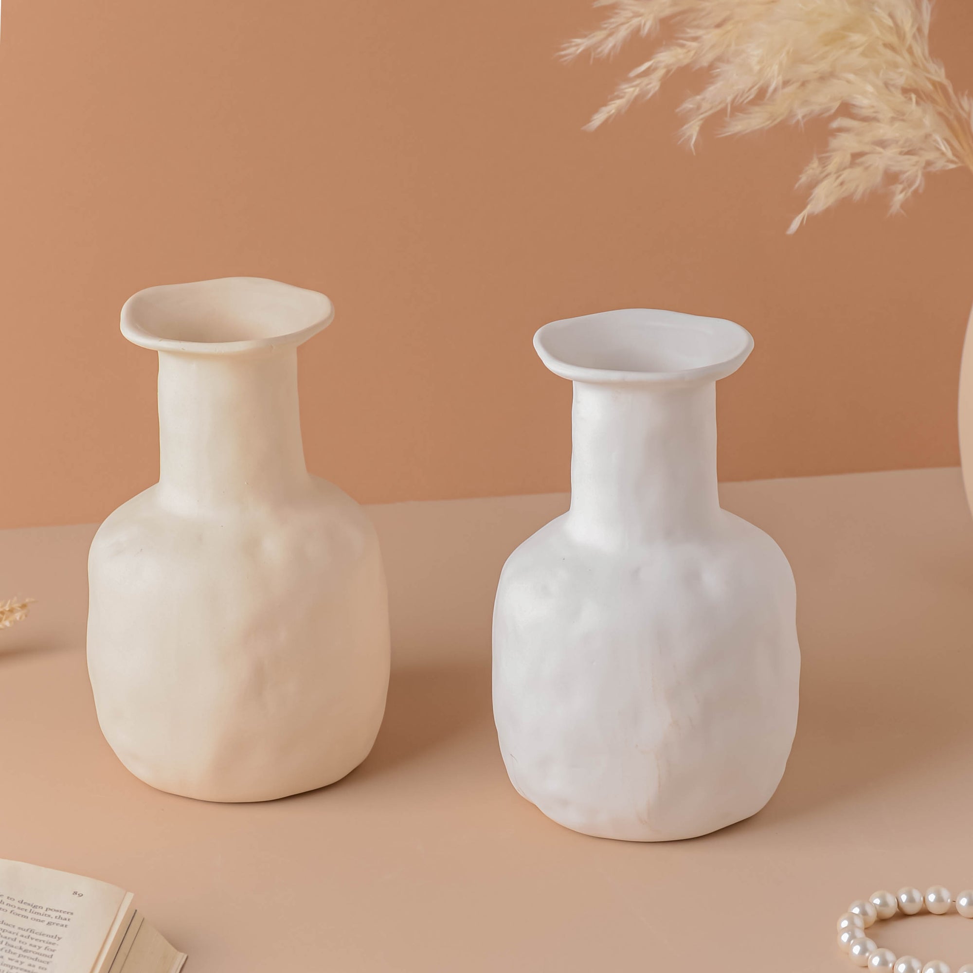 The textured vase with a narrow neck and wide base makes a wonderful accessory to bedeck one's home or office, its soft palette making it perfect for any space. The handcrafted vases have been molded with love and care and long hours of labor have been spent to bestow upon it the artistic forms and curves that make it so unique. The vase would truly pose as an upgrade for that shelf that looks dull and drab and needs a little bit of a fresh touch to sparkle up with color. The strength of this vase lies in its texture which is quite attention-grabbing and detailed. Using statement vases in white, especially one like this could also be a great step towards decluttering since the inclusion of statement pieces in one's decor can also mean doing away with too many unnecessary objects of decor.