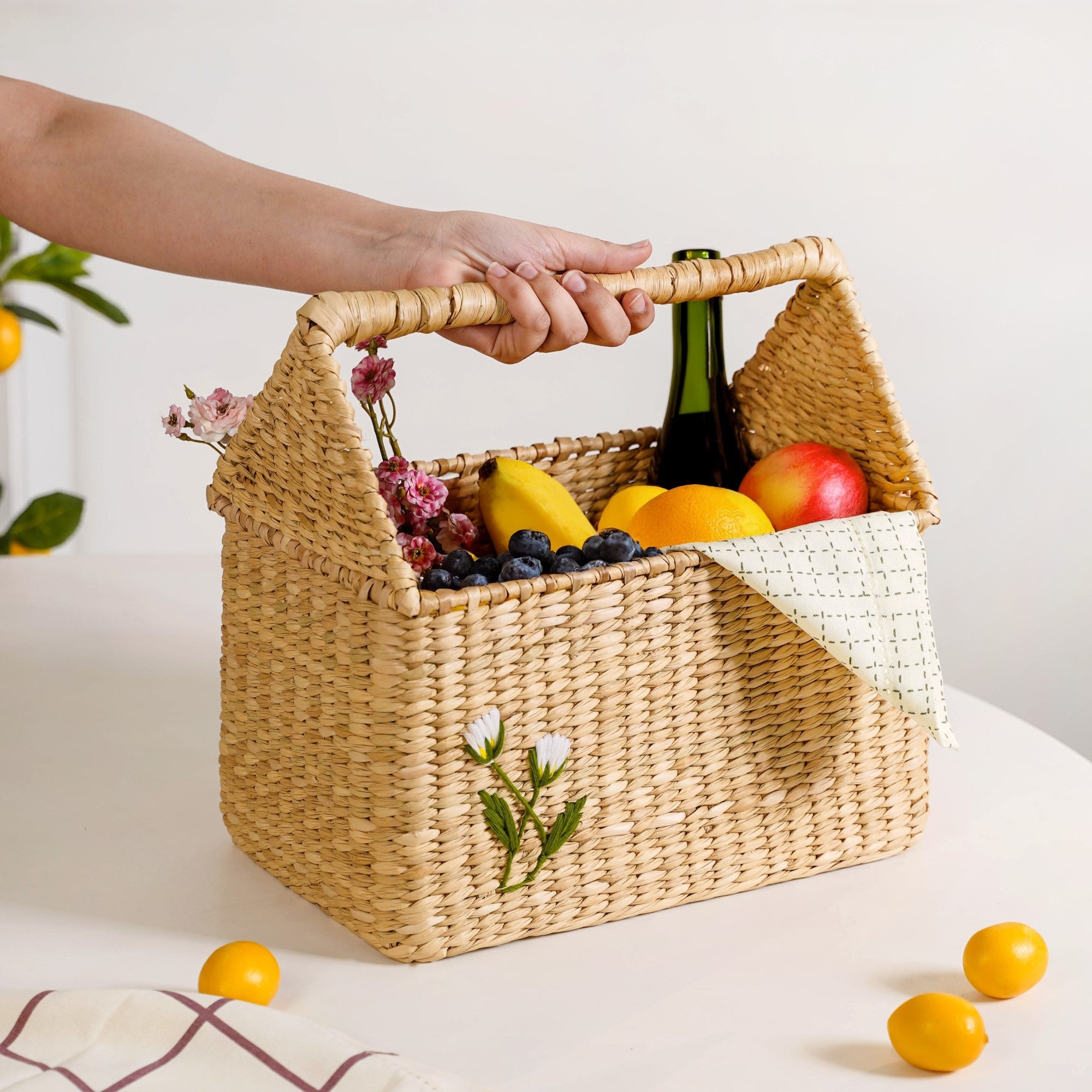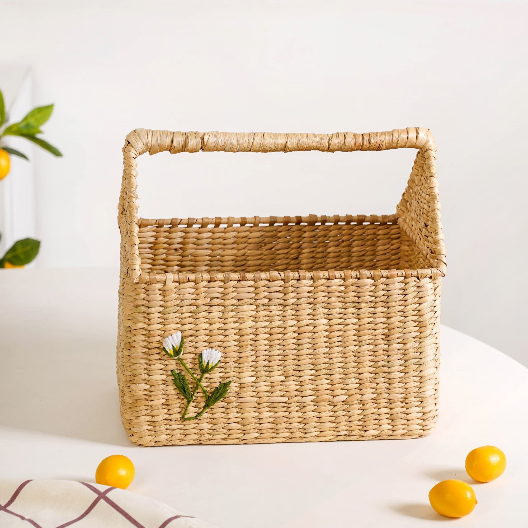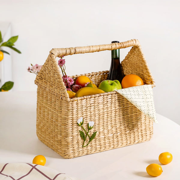 Design: This unique basket features a sturdy form and a classic, rustic handwoven design crafted from 100% organic kauna grass. The natural, light straw colour is beautifully enhanced by a delicate, floral embroidered motif on the side, adding a touch of elegance. A single, rigid handle runs across the top, ensuring it is both decorative and practical for transport.