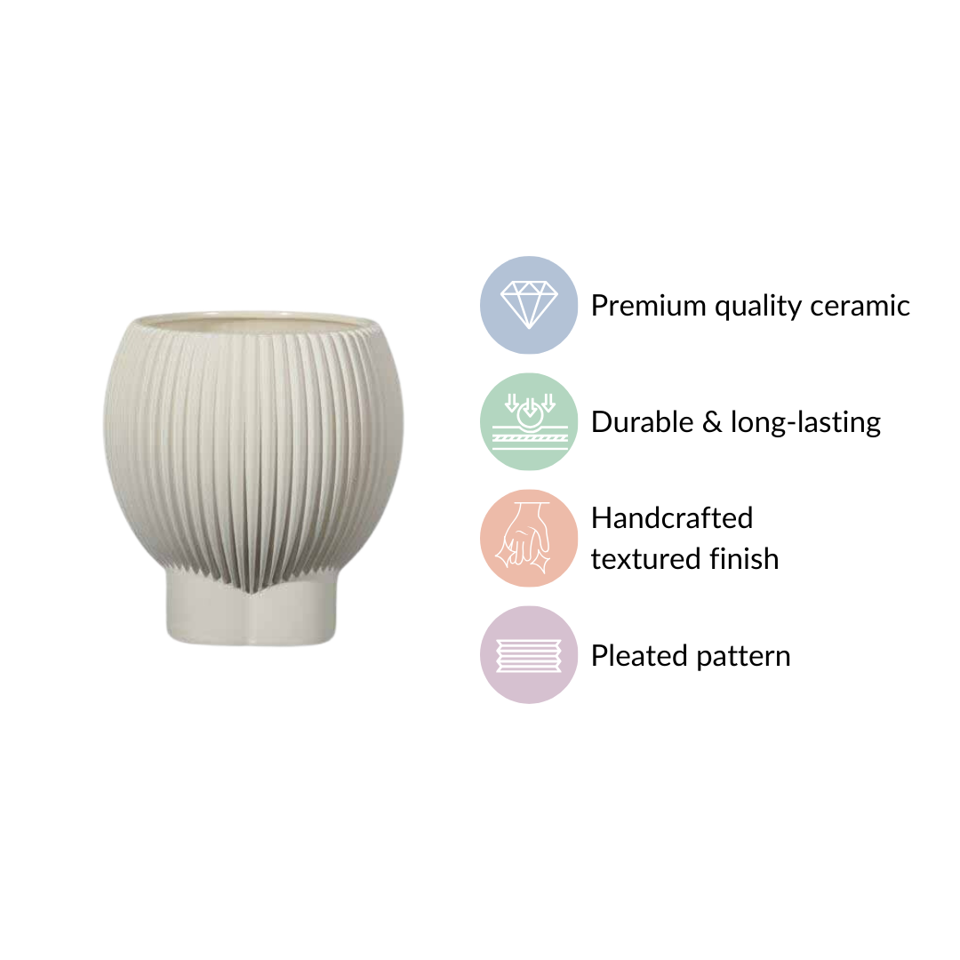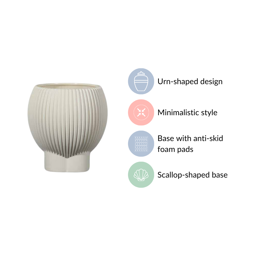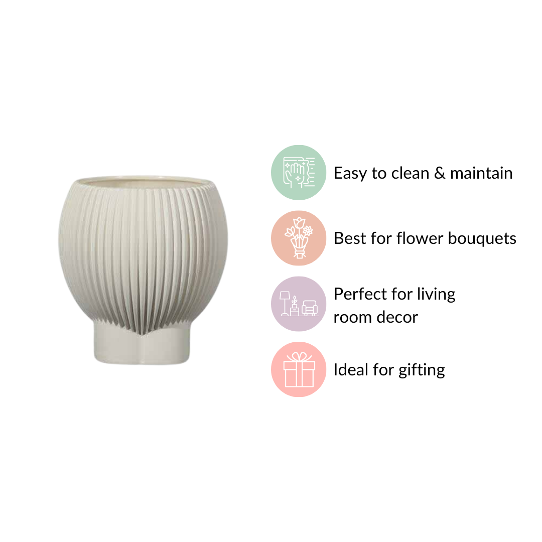 To ensure that the vase maintains its enduring charm over time, keep the vase clean by regularly dusting it with a soft, dry cloth. A clean surface will showcase its textured finish and pleated pattern effectively. Pair the vase with complementary decor items that enhance its minimalist style and urn-shaped design. Refrain from using abrasive cleaners or materials that could damage the textured finish. Stick to mild, non-abrasive cleaning solutions.