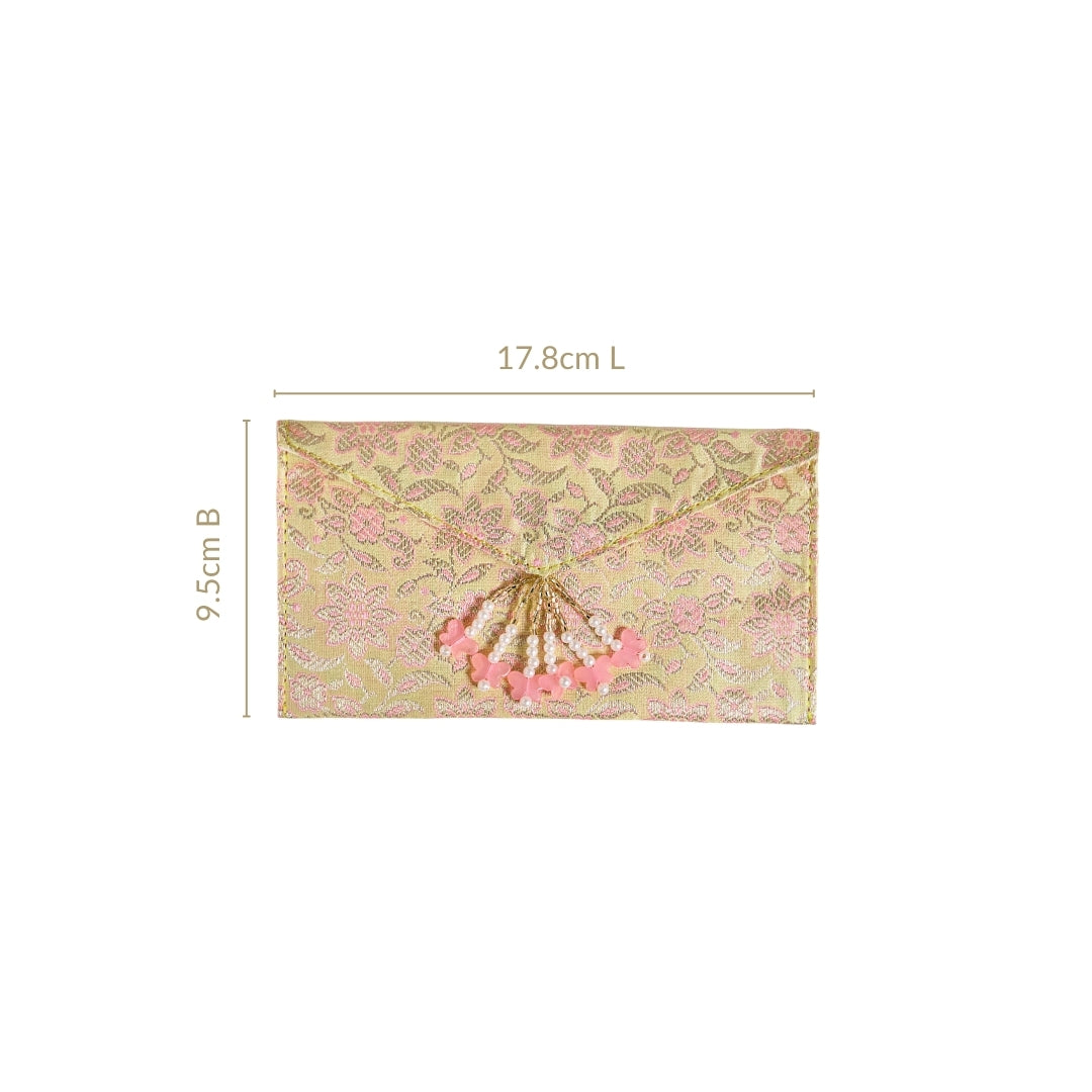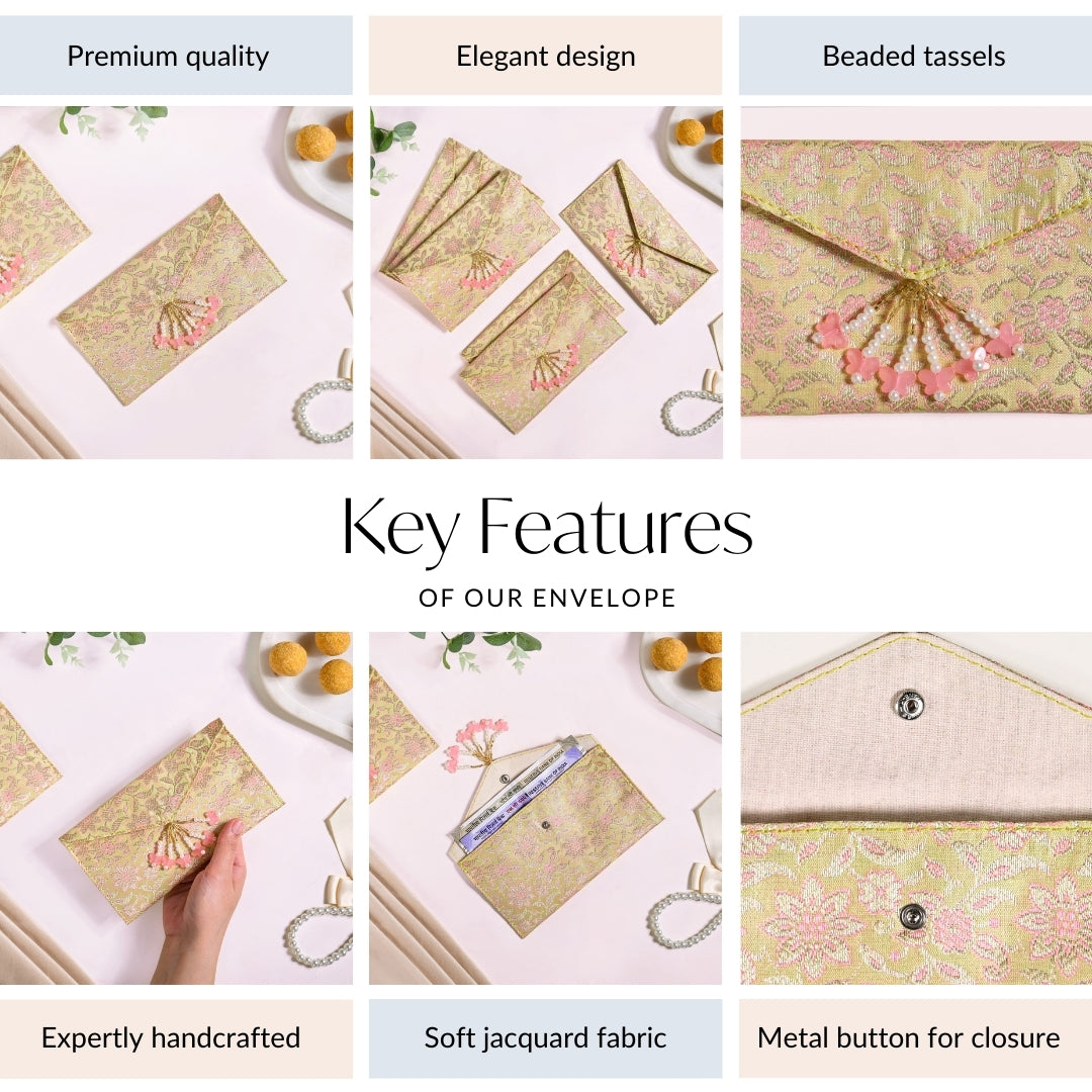 Design: Festive occasions deserve thoughtful presentation, and this handmade jacquard fabric set of 6 envelopes ensures just that. Each envelope is crafted from premium jacquard fabric, known for its intricate floral weaving, soft sheen, and durability. The envelopes feature a luxurious jacquard weave with floral patterns in soft pink and gold, set against a radiant yellow base. The flap is secured with a snap-button closure for ease of use, and is accentuated by dangling pearl-bead strands with pink butterfly charms. This combination of shimmer, pastel tones, and handcrafted embellishments makes the set equally traditional and contemporary, adding charm to every festive exchange.