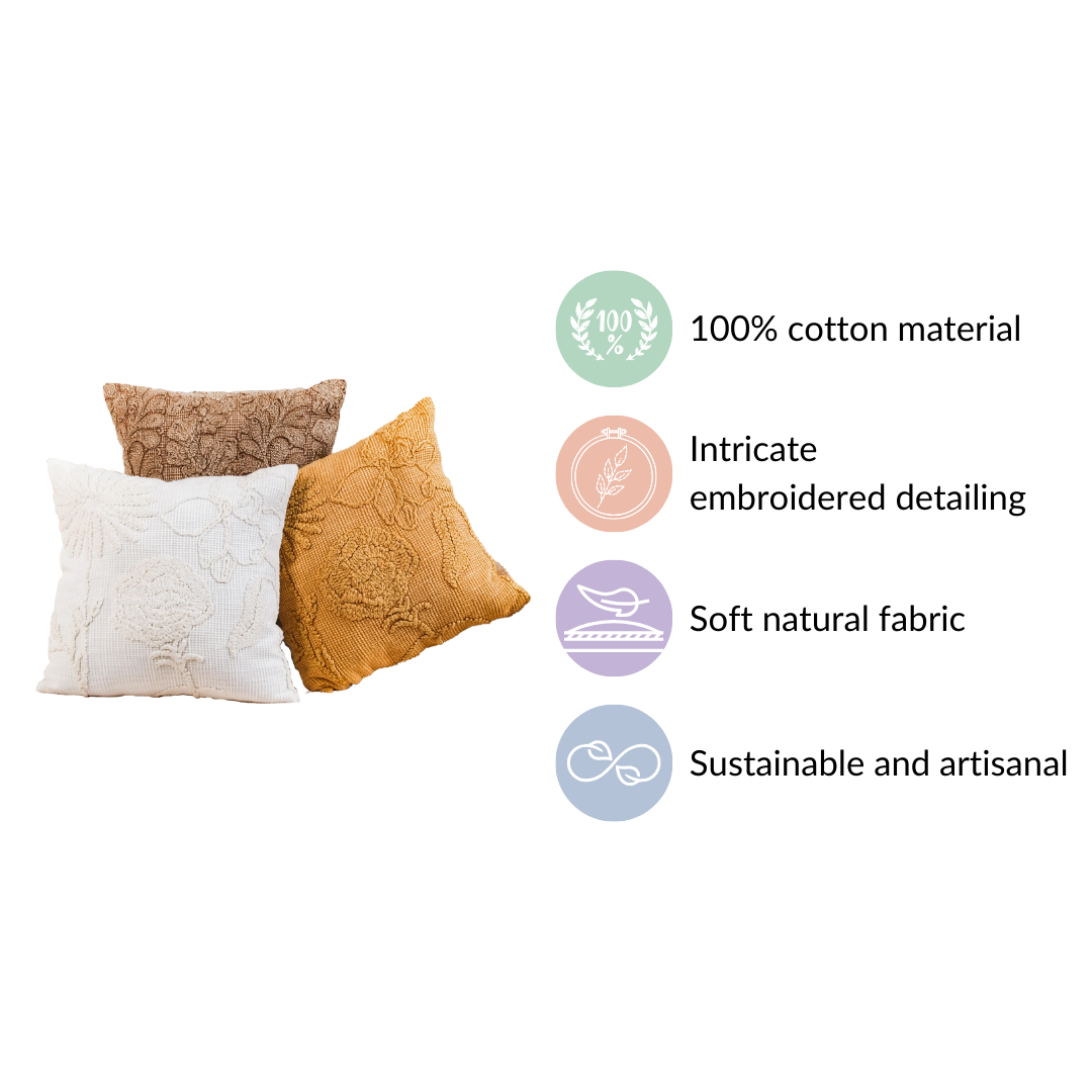 These cushion covers excel in Quality, Utility, and Beauty (QUB). Their high-quality cotton material guarantees longevity and plush comfort. The intricate embroidered detailing enhances their aesthetic appeal, making them a statement piece in any setting. Additionally, their utility is maximized with a smooth concealed zipper, ensuring easy insertion and removal of cushions.