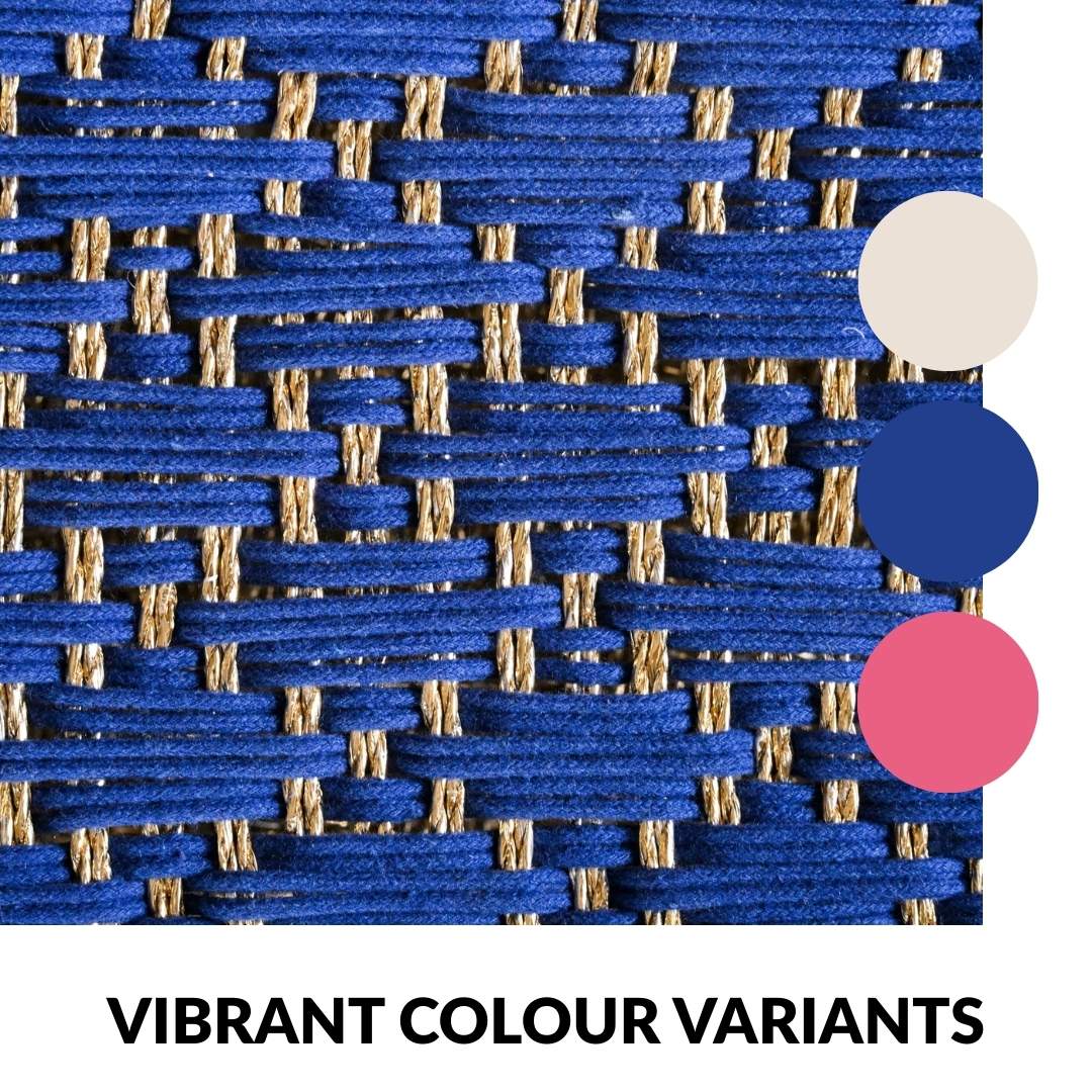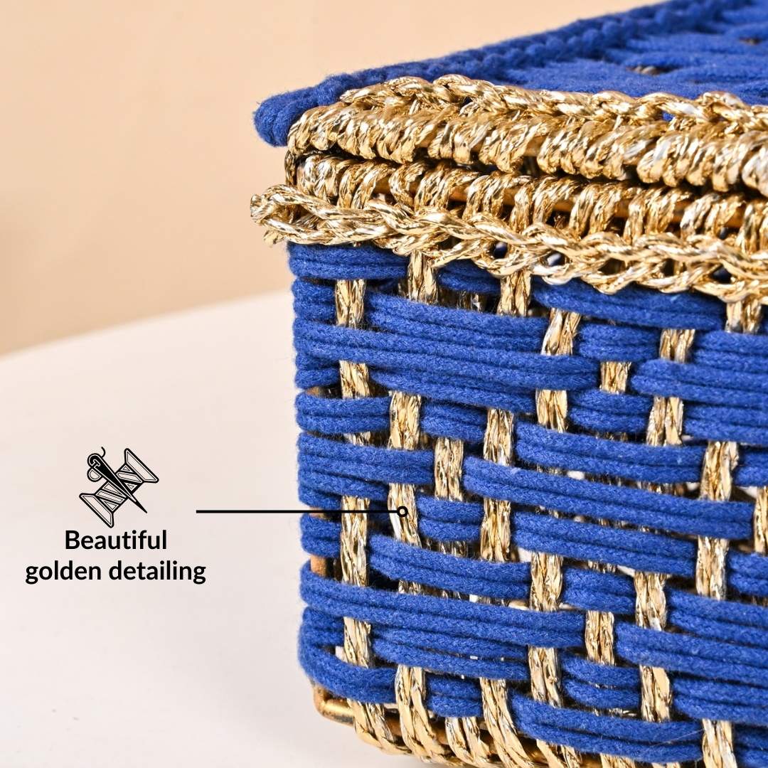 Design: This handwoven basket features a sophisticated interwoven pattern of deep royal blue cotton yarn and shimmering metallic gold. The intricate weave creates a textured finish that adds depth and a touch of luxury. It is designed with a matching lid that seamlessly continues the pattern and is finished with a neat knot-tie closure.