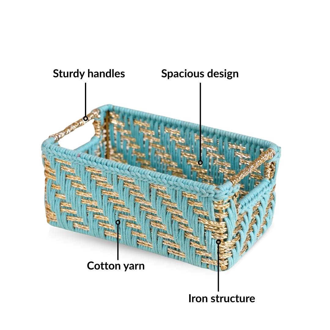 Design: The basket is handwoven in blue cotton yarn, detailed with radiant gold decorative threads that create a striking woven pattern. A sturdy internal metal frame provides structural support, and a reinforced rim helps maintain its rectangular shape. The open-top design comes with two side handles.