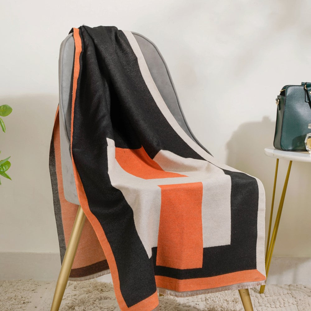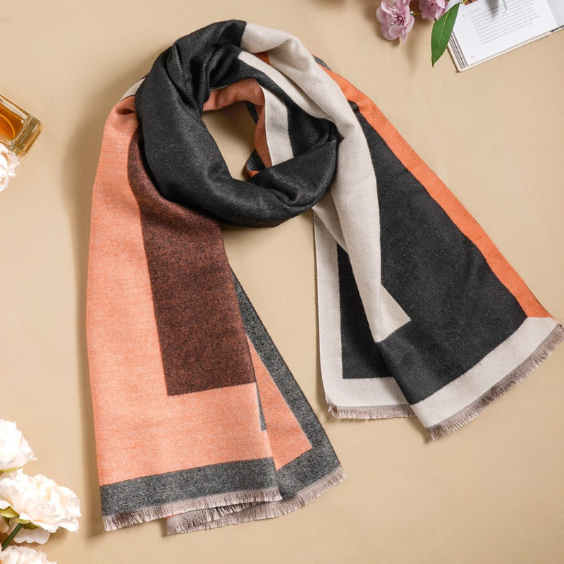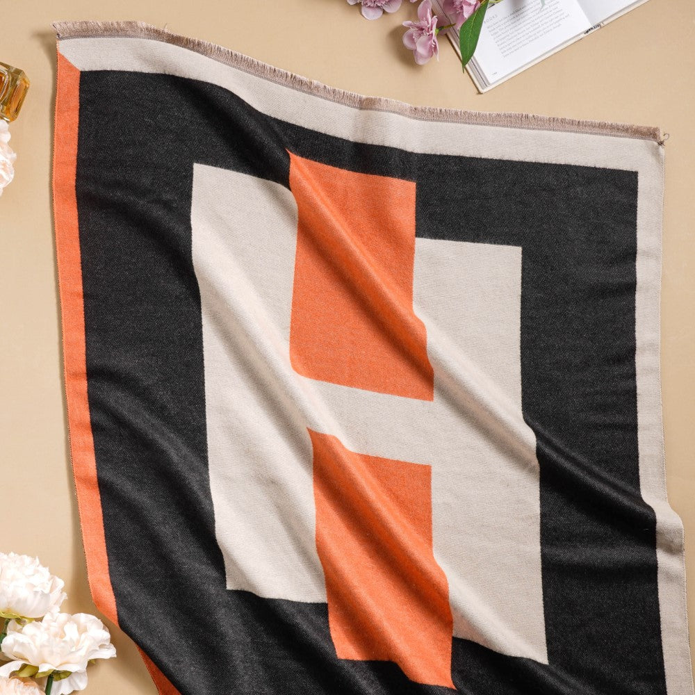 The blanket scarf comes in a multicoloured design featuring a range of solid colours, including orange, black, and white. The vibrant colour combination makes the winter scarf a worthy showstopper and an instant eye-catcher. Pair the ladies' scarf with any dark-coloured outfit to create an iconic and bold fashion statement. Not to mention, the smooth and soft texture of the polyester scarf makes it extremely comfy and cosy to beat the chilly winter days.