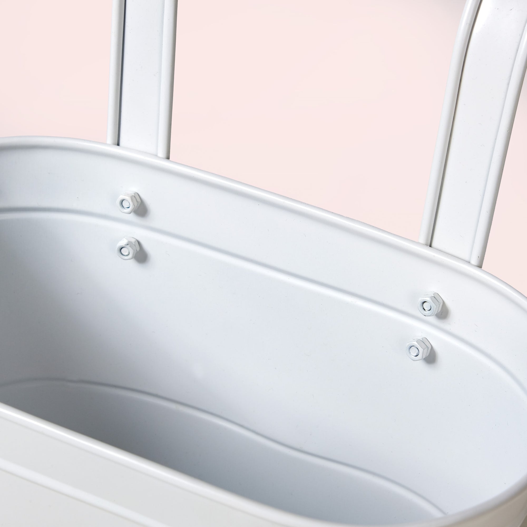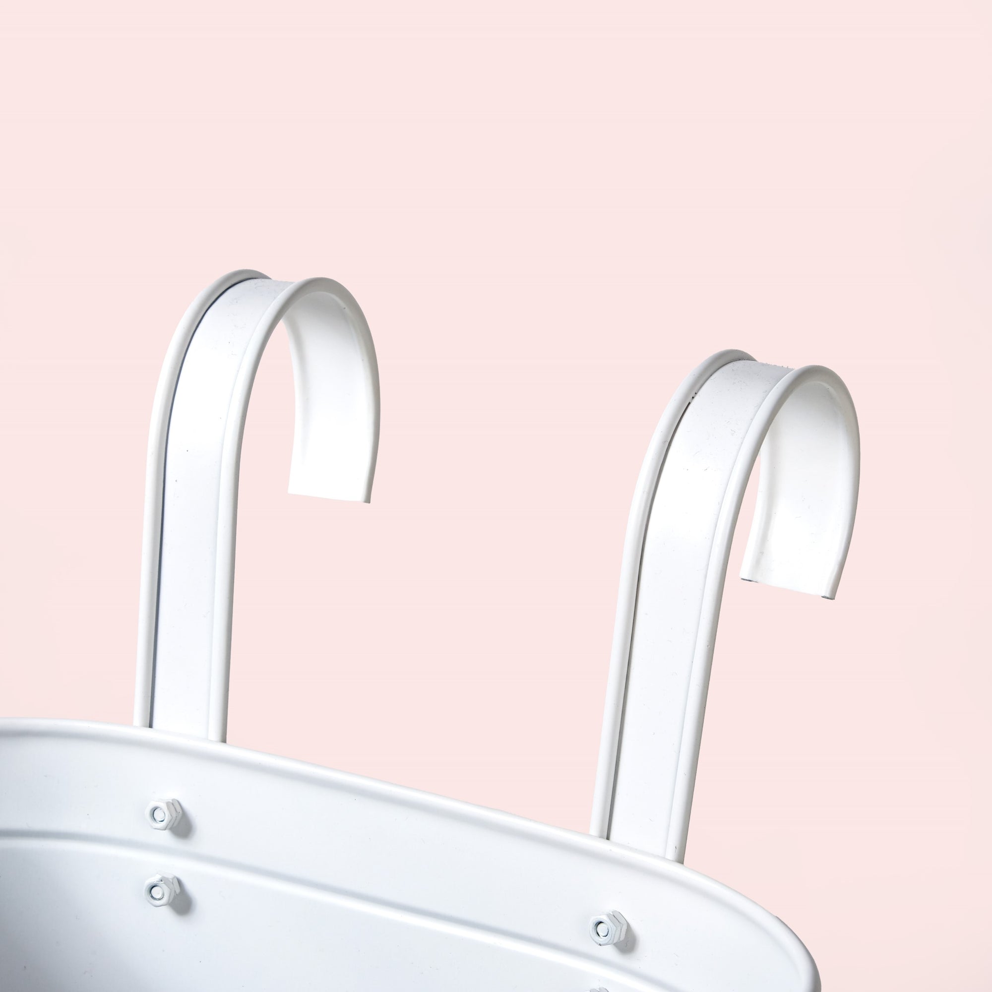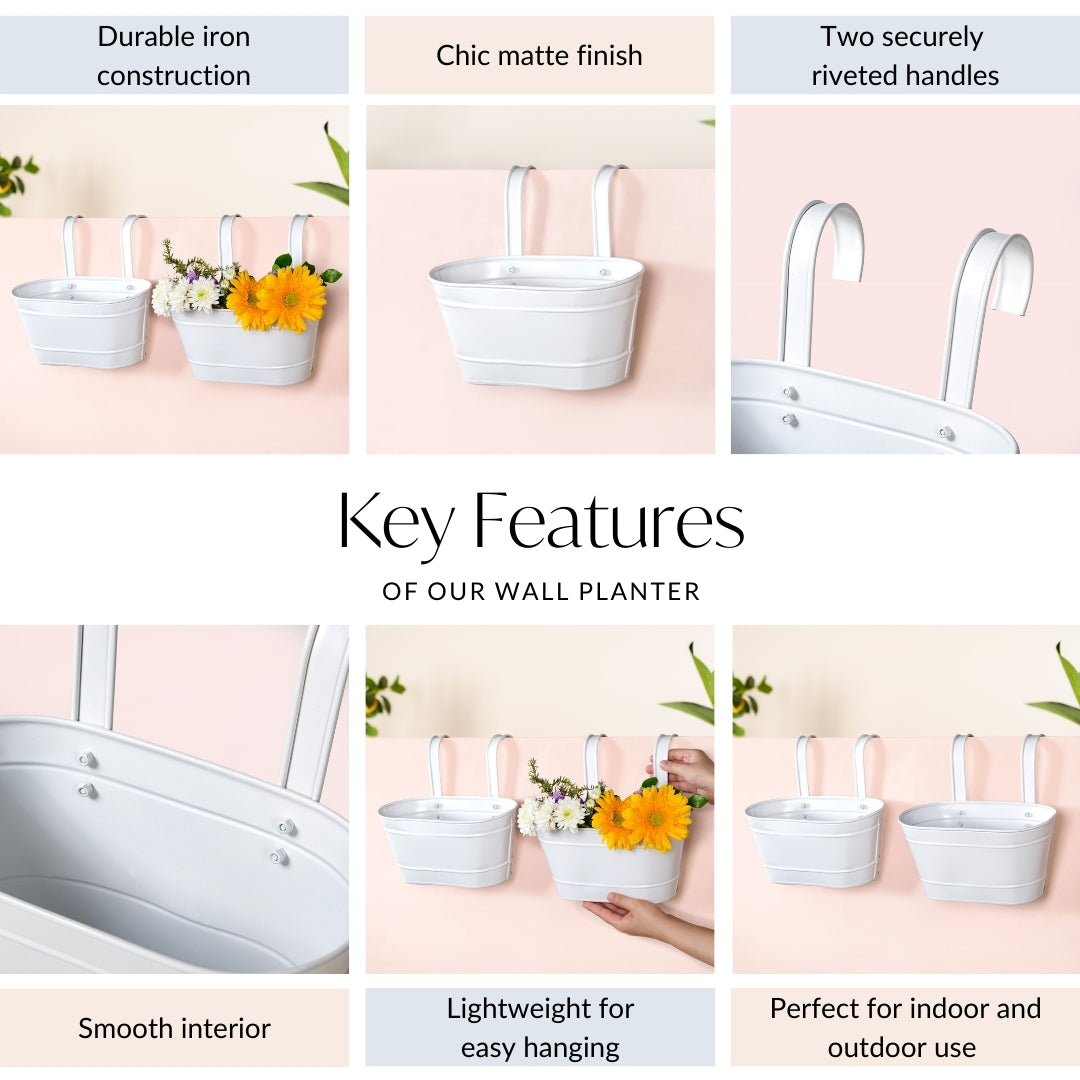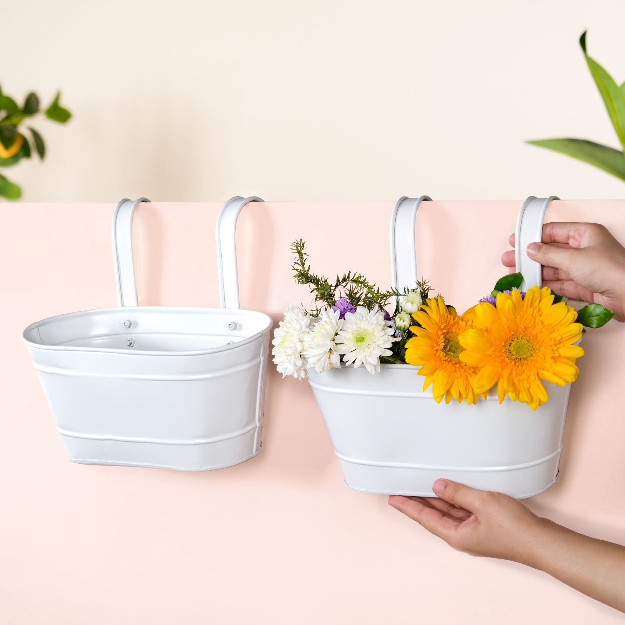 Design: Our new hanging planter set is crafted from durable iron, with each wall planter finished in a stunning matte pearl ivory white coating. The oblong shape and subtle horizontal grooves give each bucket a unique and modern feel. The two hanging handles are securely attached with strong rivets, ensuring they sit perfectly on any balcony railing. With a smooth, seamless interior, these pots can also be stacked to save space when not in use.