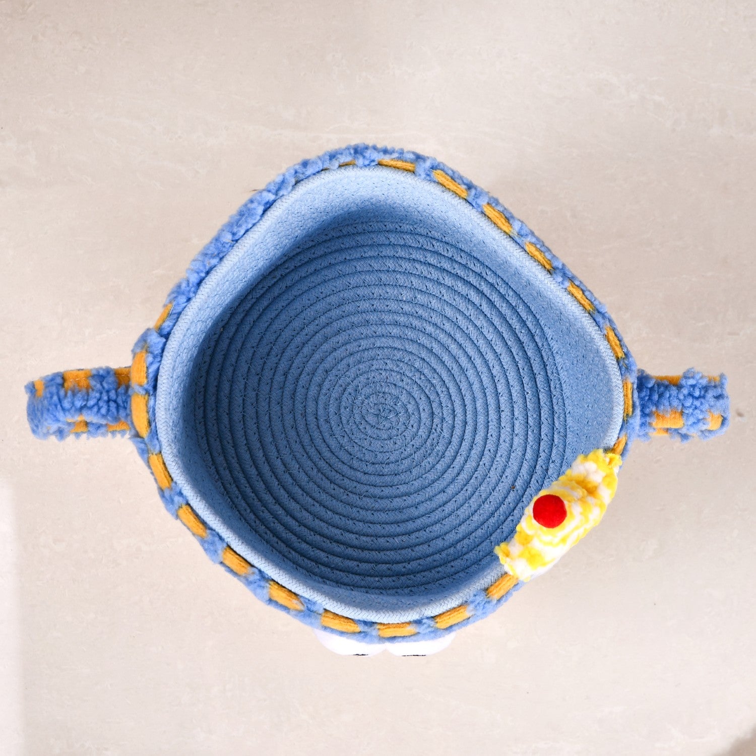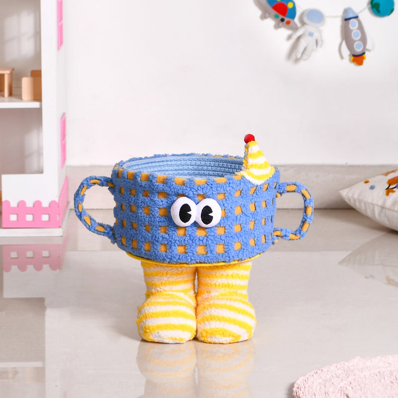 Design: Designed with a plushy checkered body in sky blue and warm yellow, this storage basket is an instant mood-lifter! Its big, playful eyes make it feel like a friendly little buddy rather than just an organiser. The fluffy striped legs give it a lively stance, almost as if it’s ready to waddle around. But the most delightful detail? A tiny plush hat topped with a cherry, adding just the right touch of quirkiness! Designed with sturdy side handles for easy movement, the basket features an MDF inner lining for durability and a soft cotton roped lining inside to keep stored items safe and snug.