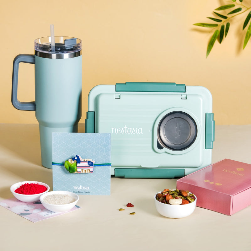 Surprise your baby brother with our fun and festive Rakhi hamper, tailor-made for the little foodie who loves mom's homemade delights. This playful set includes a cute Rakhi band, a cool sipper bottle, and a handy lunch box with a spoon and chopsticks. We've also added a roli-chawal set for tradition, a pack of yummy dry fruits, a small gift box, and a large gift box for extra surprises. Top it all off with a cheerful wish card. This gift hamper is the perfect mix of love, tradition, and fun, ensuring your brother has the best Raksha Bandhan ever!