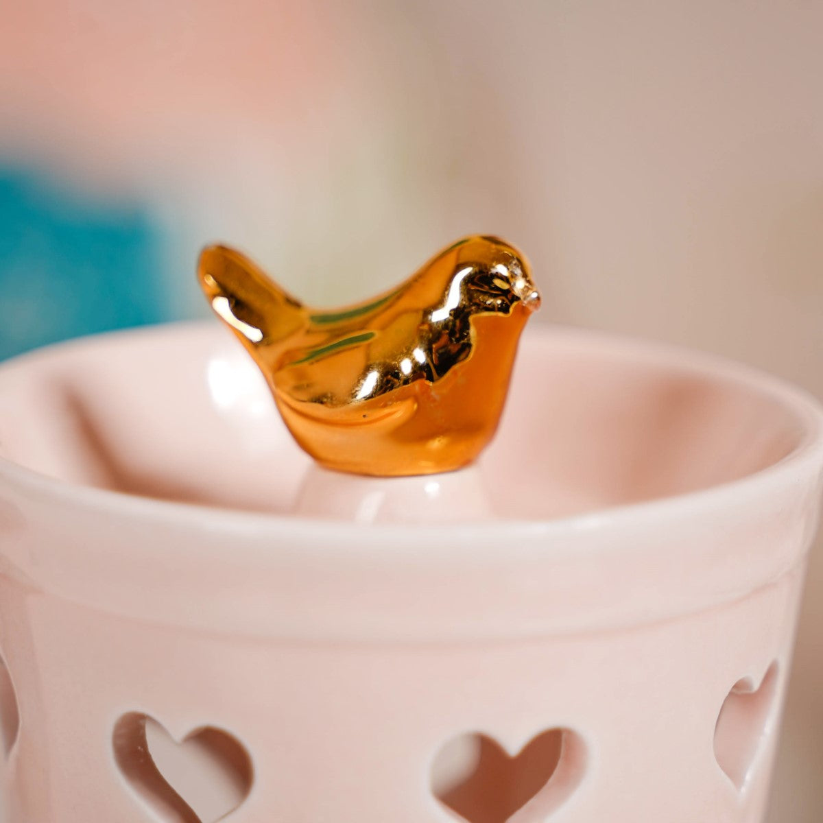 Enhance the grandeur of your celebrations with our enchanting pair of matching candle holders. Crafted with precision, these holders feature intricate cut-out heart patterns that cast a captivating, romantic ambience when the candles glow. Each lantern boasts a delicate golden bird perched on the lid and a spacious base for easy candle placement. Whether it's Diwali or any festivity, these high-quality ceramic candle holders effortlessly elevate the atmosphere.
