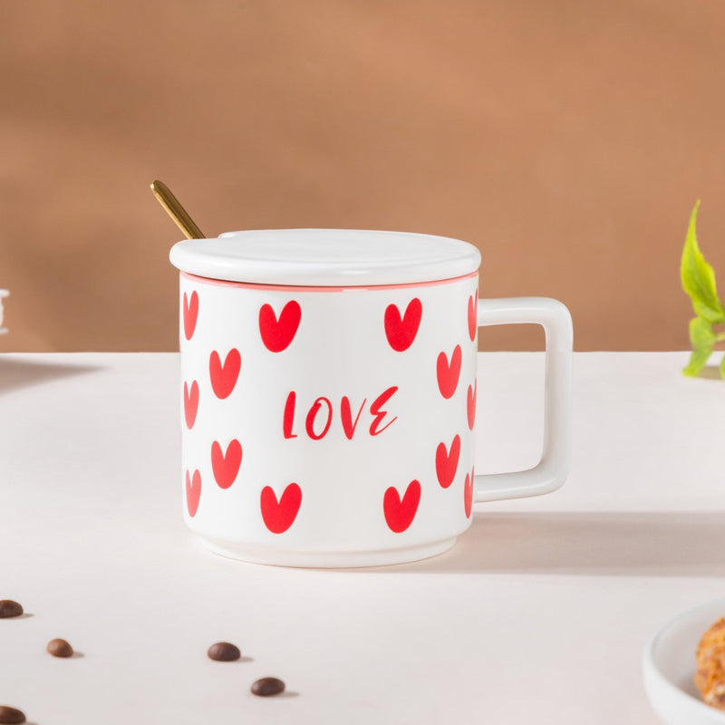 Experience 'love' in a mug with the adorable printed ceramic mug. The red heart patterns contrast beautifully with the polished white mug and makes it a rather eye-catching item. The coffee mug is provided with a matching lid and a gold stirring spoon. Enjoy a morning cup of hot steaming coffee or tea in the white ceramic mug or gift it to loved ones on special occasions. The mug is safe to use in the microwave.