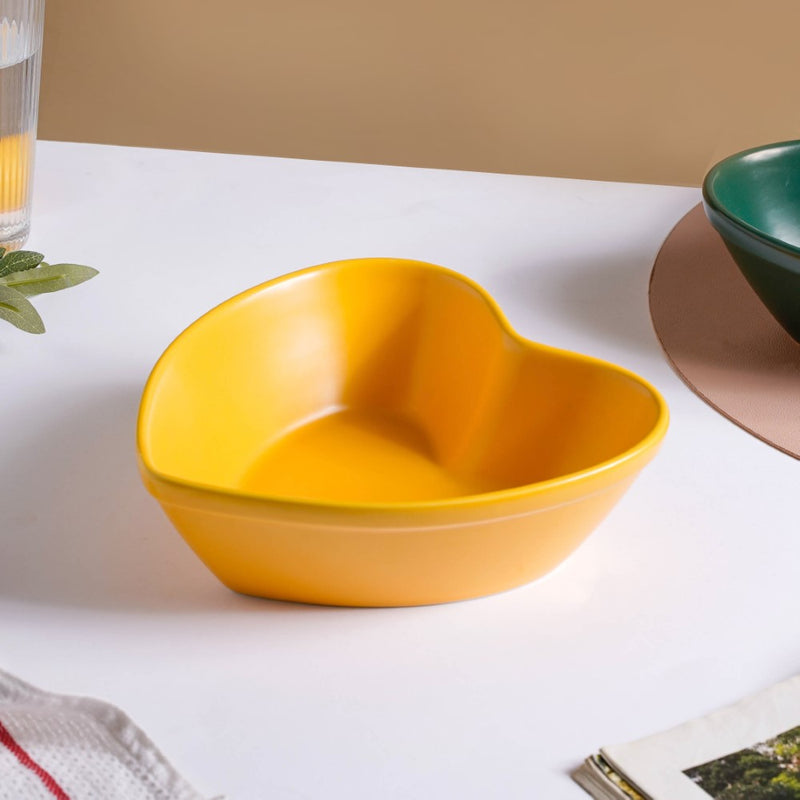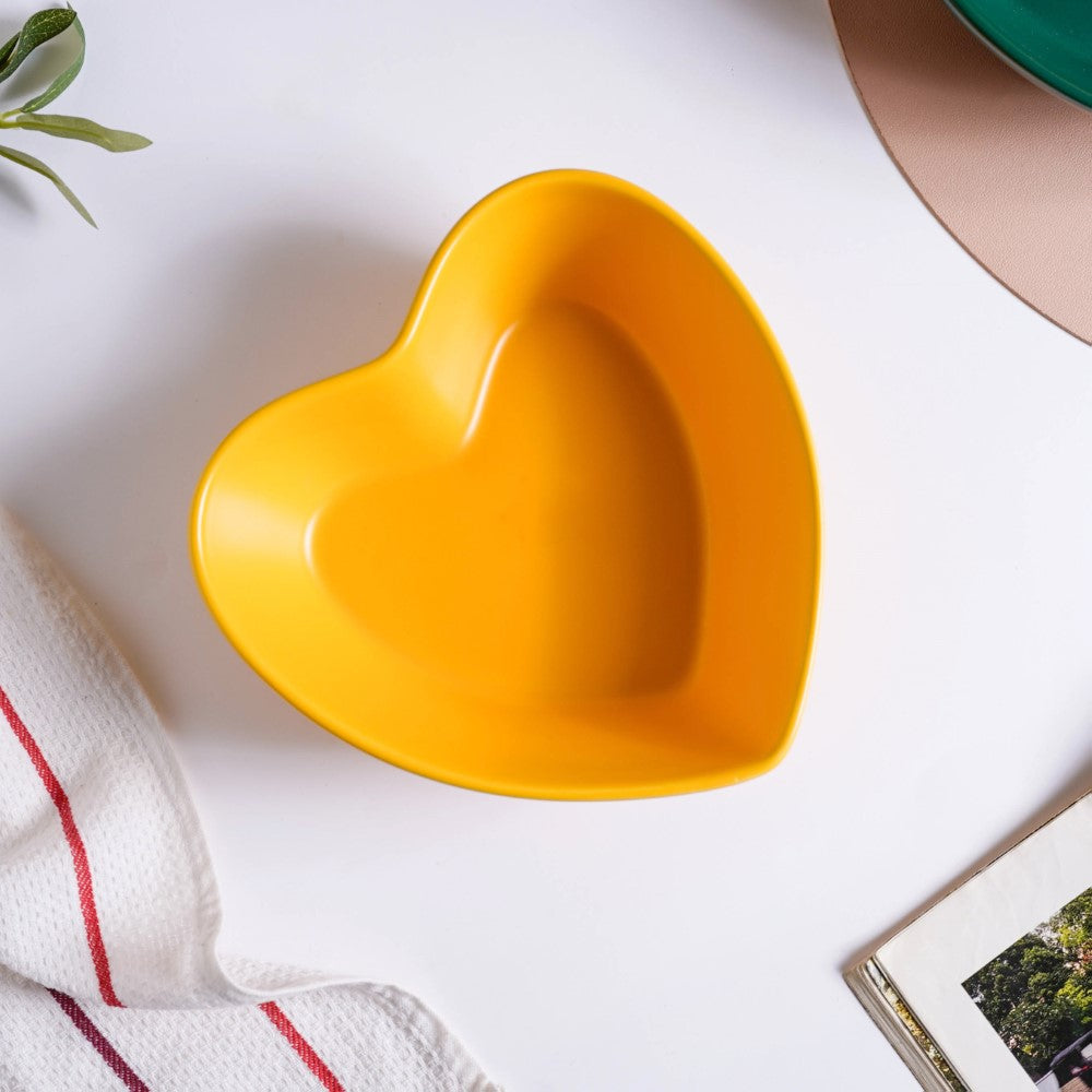 Heart shaped baking bowl that is made of ceramic and comes in a bright yellow colour. The baking bowl can be used to bake desserts like cake, ricotta cake, or baked dishes like au gratin, veggies, and chicken or simply use the ceramic bowl for serving snacks. Use the bowl to serve breakfast dishes or side dishes at lunch or dinner. The bowls are microwave safe for baking.