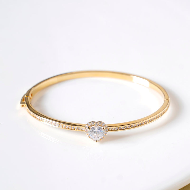 Some jewellery whispers elegance, but this bracelet speaks straight to the heart. A delicate row of twinkling stones graces the front, catching the light with every movement. But the real showstopper? A dazzling diamond-heart centerpiece, wrapped in a golden embrace and dusted with even more shimmering stones. Romantic yet refined, this piece is made to be more than just an accessory—it’s a little love story for your wrist, perfect for adding a hint of sparkle to your everyday glow.