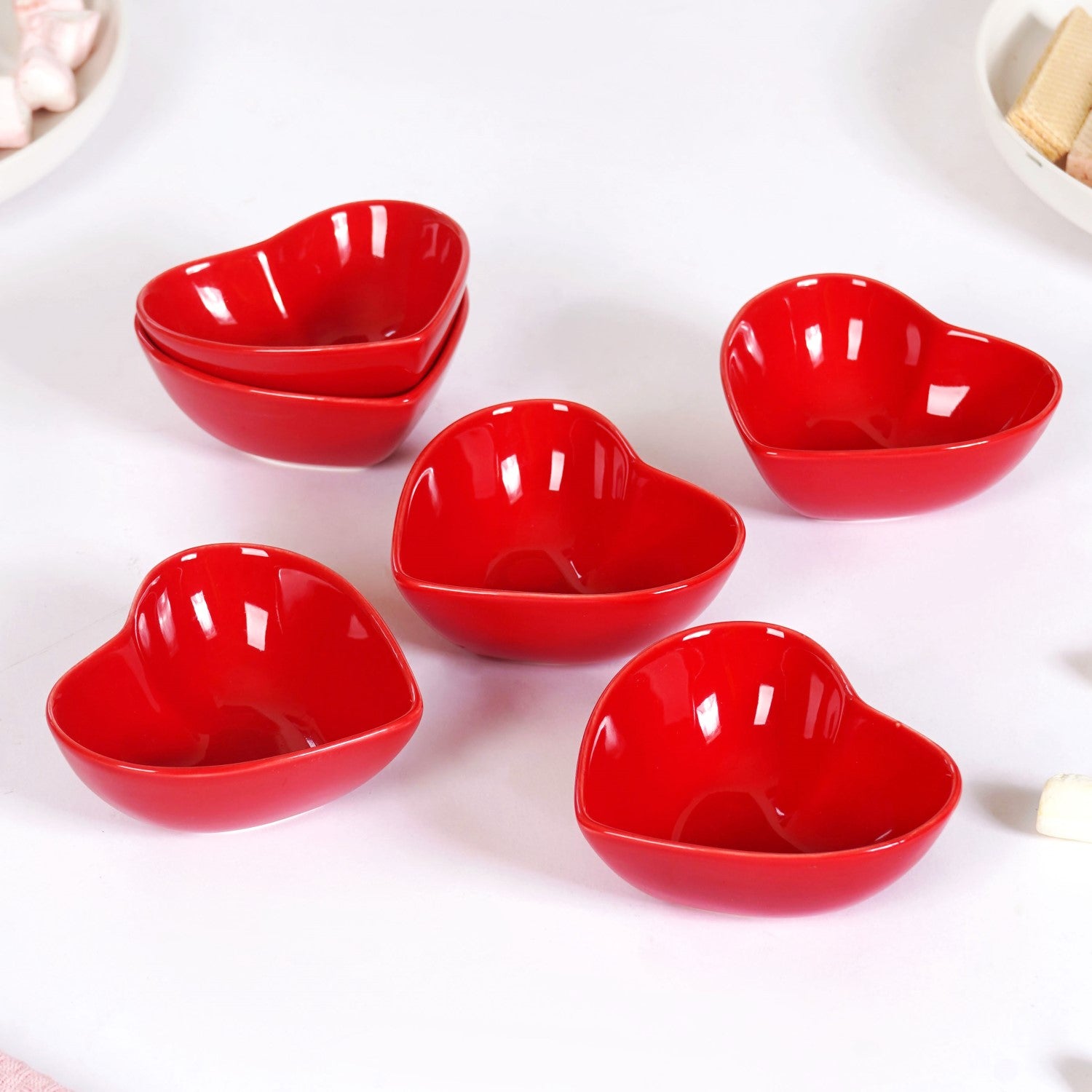 Heart bowl set of 6 that has a striped texture on the outer surface and comes in two colours to choose from. Use the mini heart shaped bowls in pink and red for serving small portions of knick knacks, candies or cereals at breakfast. The small heart dish made in ceramic can also be used to bake a mini heart shaped cake, soufflé or pudding. The microwave safe bowl can also be used to heat food.