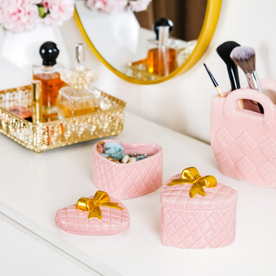 Transform your gift-giving moments with our pink-coloured heart-shaped gift box set, containing two beautifully crafted ceramic boxes. Crafted with precision, these boxes feature diamond-textured designs on both the exterior and lids, crowned with golden bows. Ideal for storing trinkets or small jewellery pieces, these versatile containers are also food-safe, allowing you to store dry fruits and other food items.