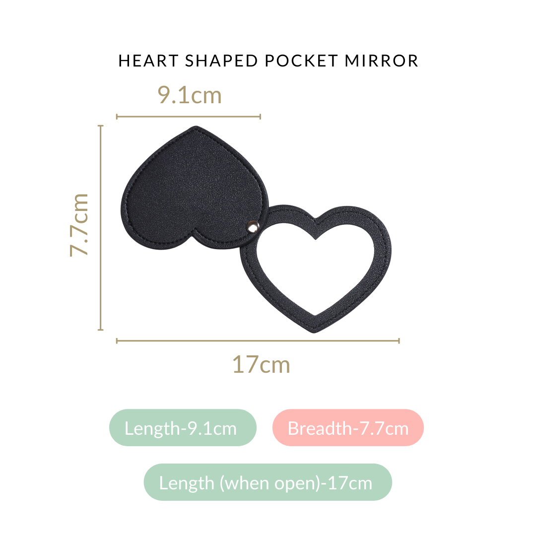 Within the fatalistic of darkness's allure that invites us to explore the depths of our hearts, we find that love does rule all, especially ourselves. Meet the heart-shaped mini pocket mirror, where love and mystery merge into a single, captivating accessory. Crafted from sleek black PU leather, this compact mirror is the epitome of edgy sophistication. The heart shape, a symbol of love, contrasts beautifully with the deep black colour, creating a design that is both romantic and daring. The smooth, matte finish of the PU leather case exudes a luxurious feel, while its compact size makes it a perfect fit for your purse or pocket. The interior features a high-quality mirror that provides a clear, crisp reflection, ensuring you always look your best. Perfect for a night out, a quick touch-up during the day, or as a chic accessory on your vanity, this heart-shaped pocket mirror is the practical fashion accessory you never knew you needed. So, what are you waiting for? Add this mini mirror to your cart today!