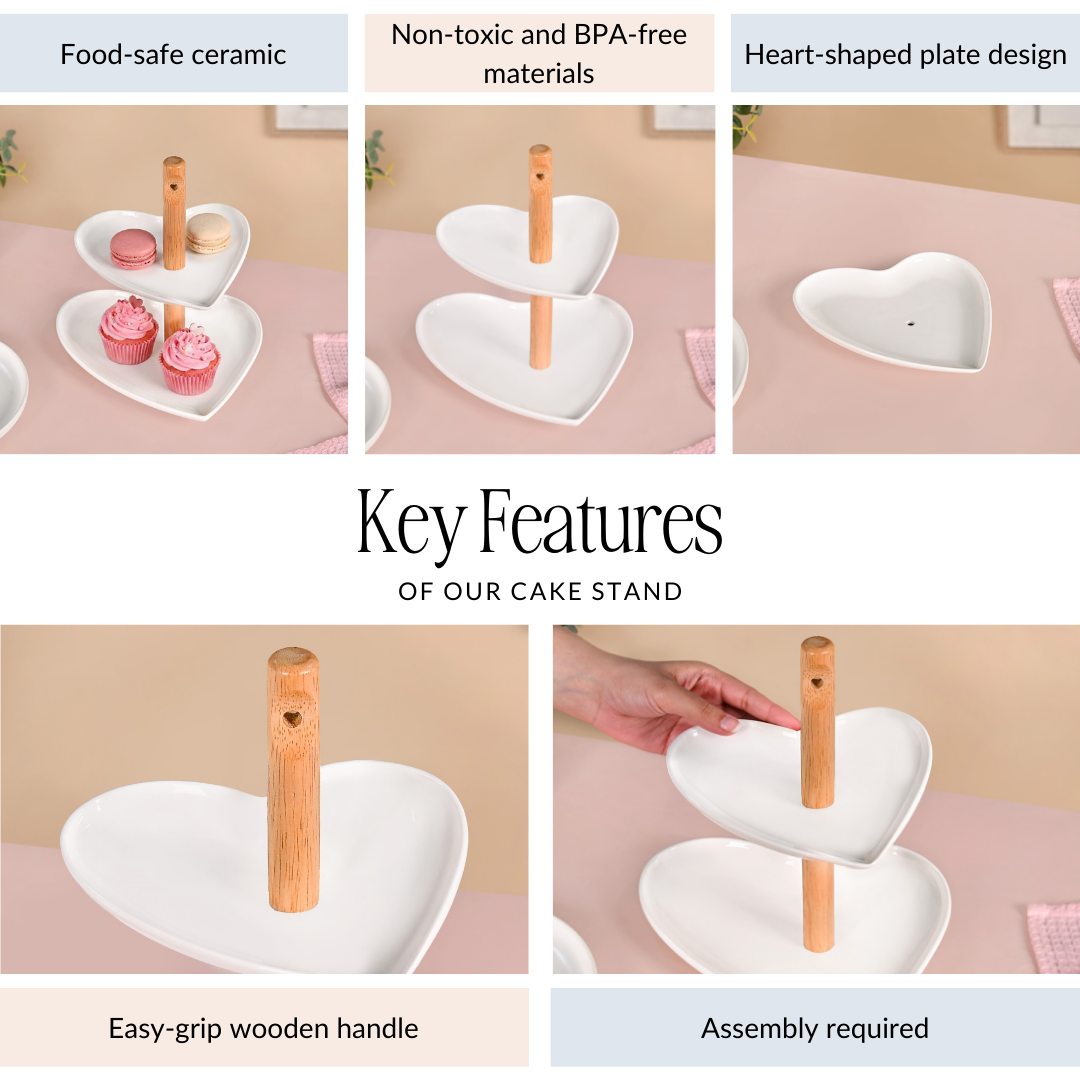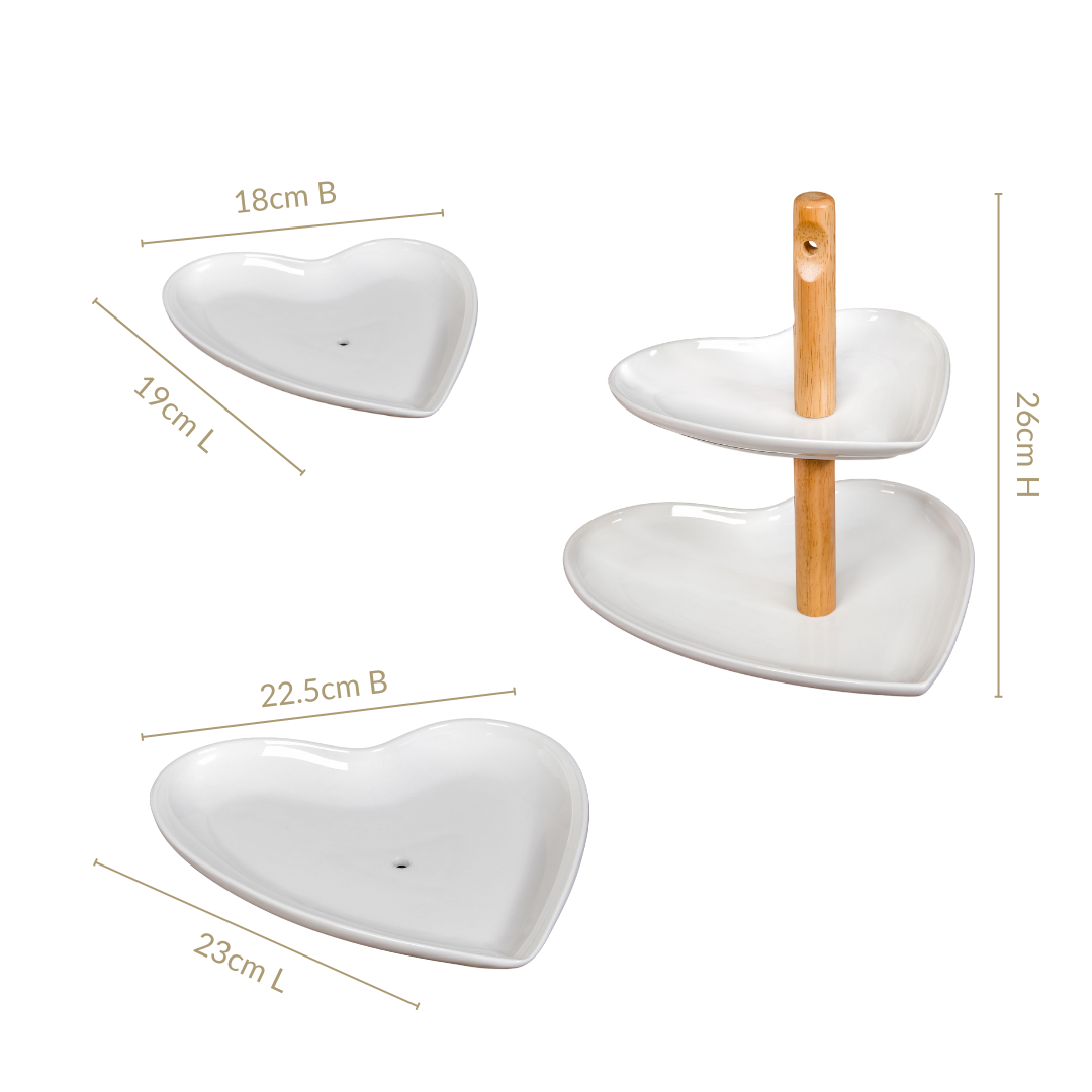 Benefits: Perfect for serving cakes, cupcakes, or appetisers, this heart-shaped two-tier stand combines beauty and functionality. The sturdy bamboo frame ensures stability, while the ceramic plates are durable and easy to clean. Ideal for parties, gifting, or festive decor, it adds charm and a delightful centrepiece to any celebration.