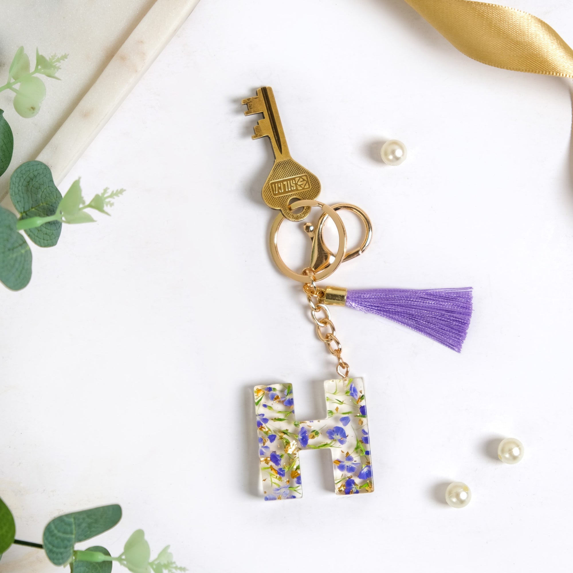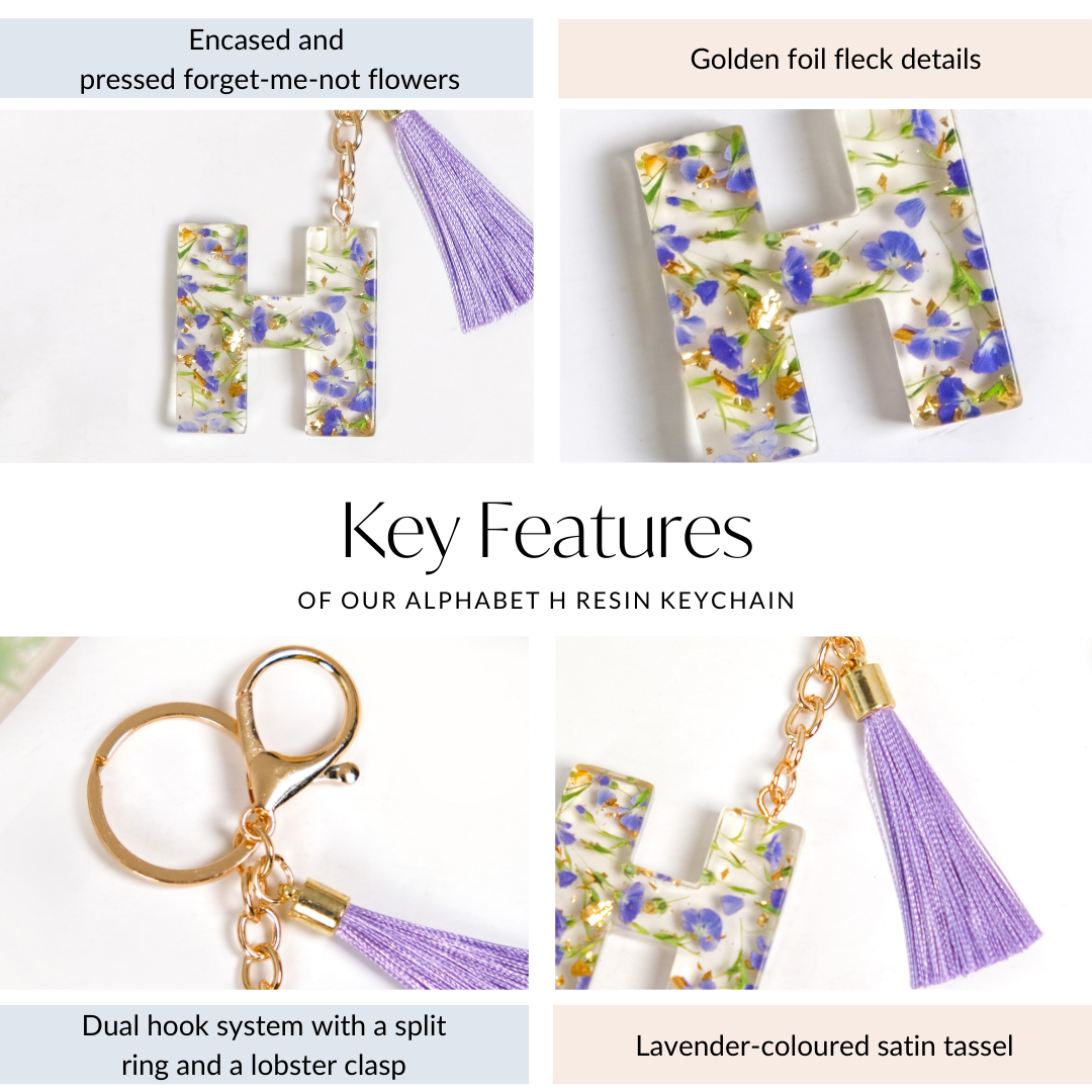 Add a touch of nature-inspired charm to your collection with the resin art "H" keychain. The adorable keyring is adorned with pressed forget-me-not flowers in lavender and shimmery gold paper foil flecks all set in a transparent resin case.