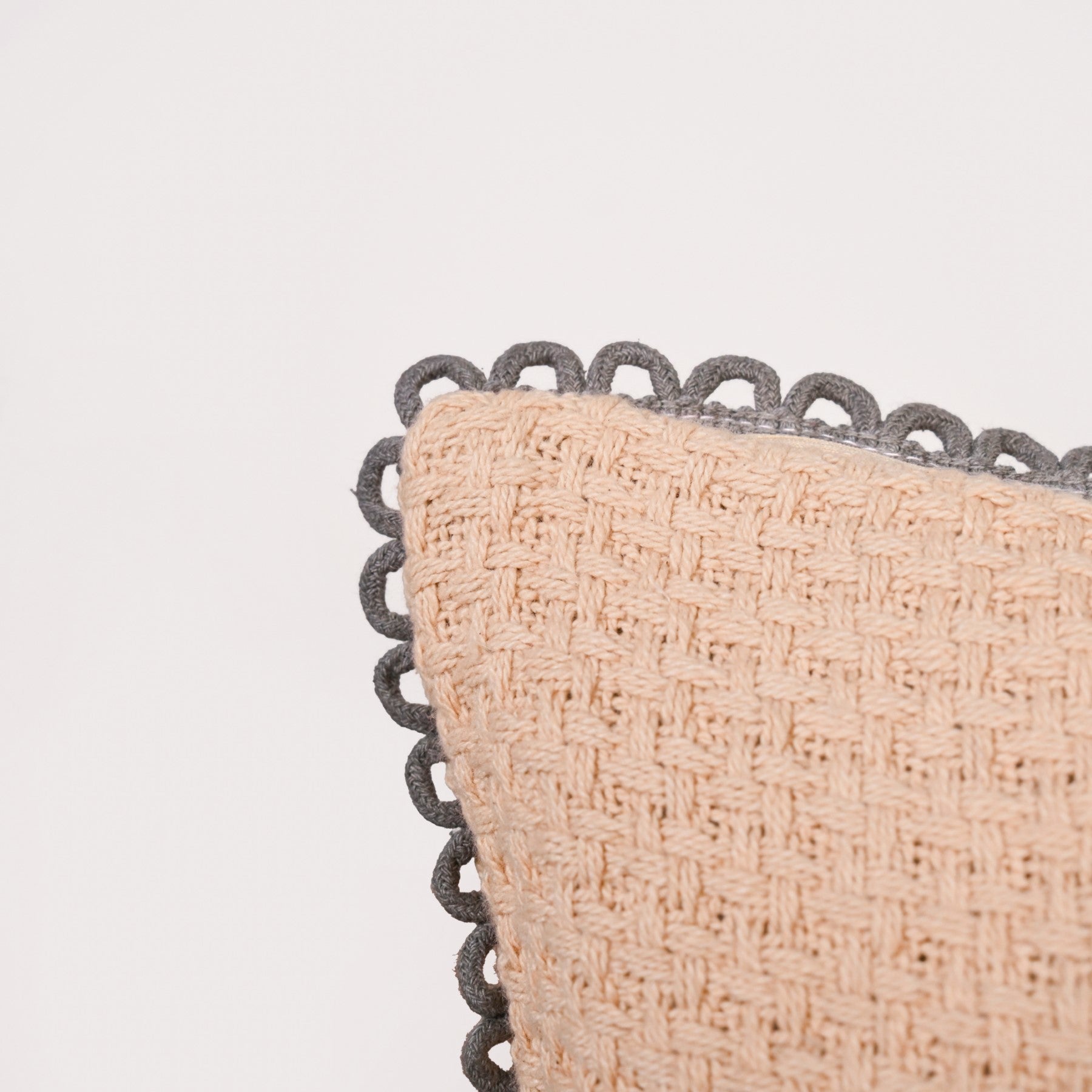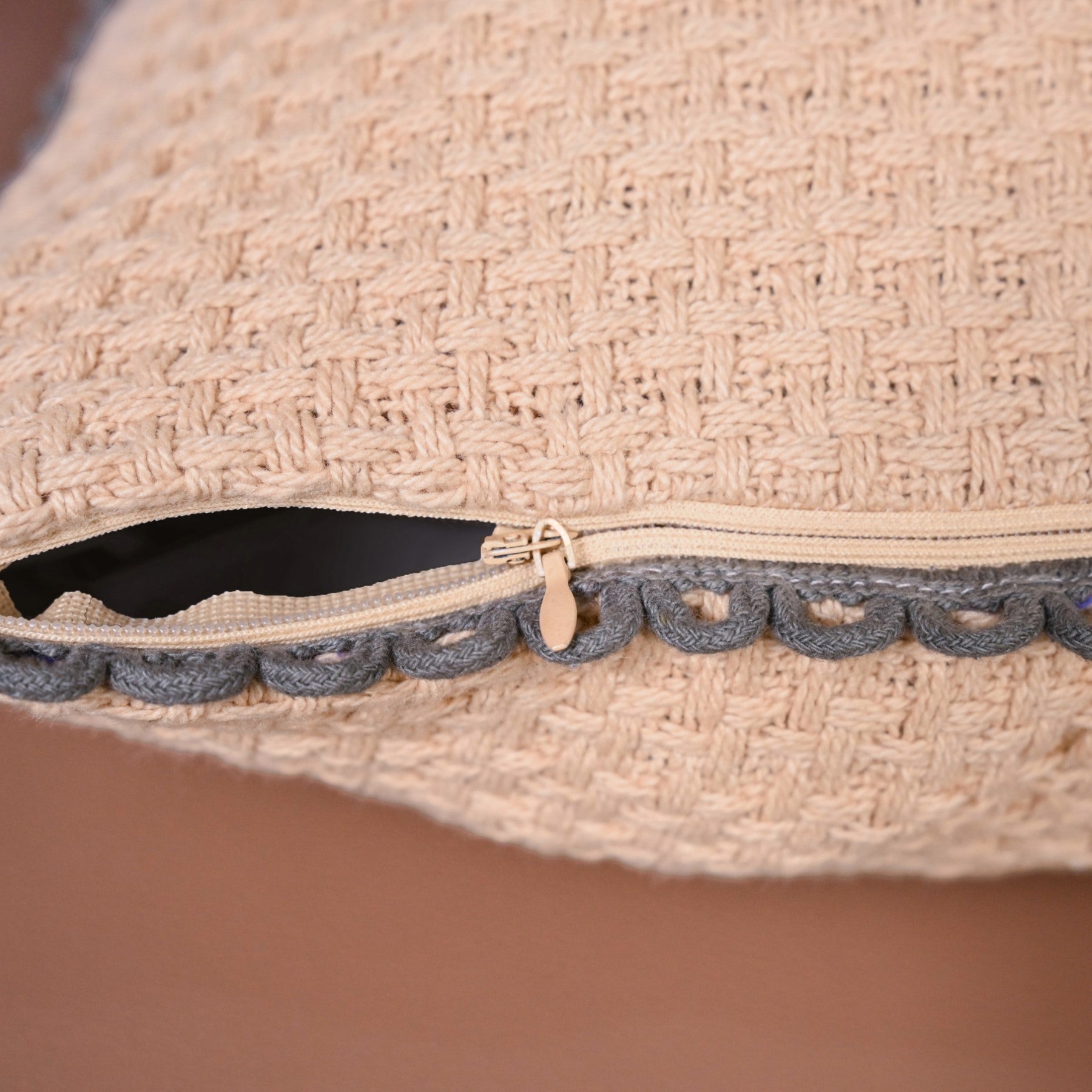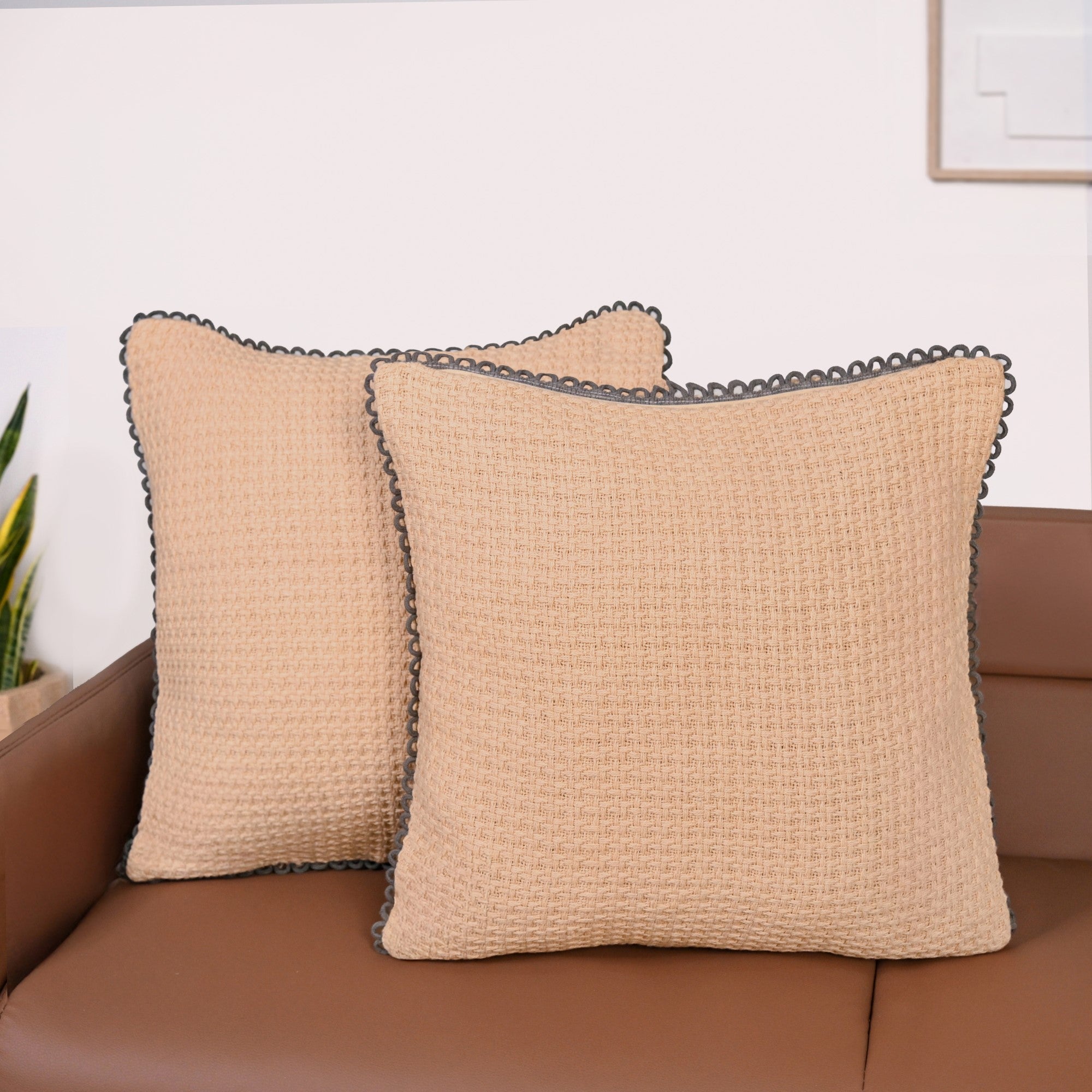 Design: Made from thick cotton, each cover has a soft feel and a neatly woven texture that brings in just the right amount of detail. The beige surface is finished with a flat semi-circle dori lace in green that frames the edges beautifully. A hidden zipper in a matching colour keeps things clean and simple. Both covers come in a perfect square shape that fits easily across cushions on your sofa or bed. The material feels cosy while still holding its shape. It's a design that works well for both relaxed and styled spaces.