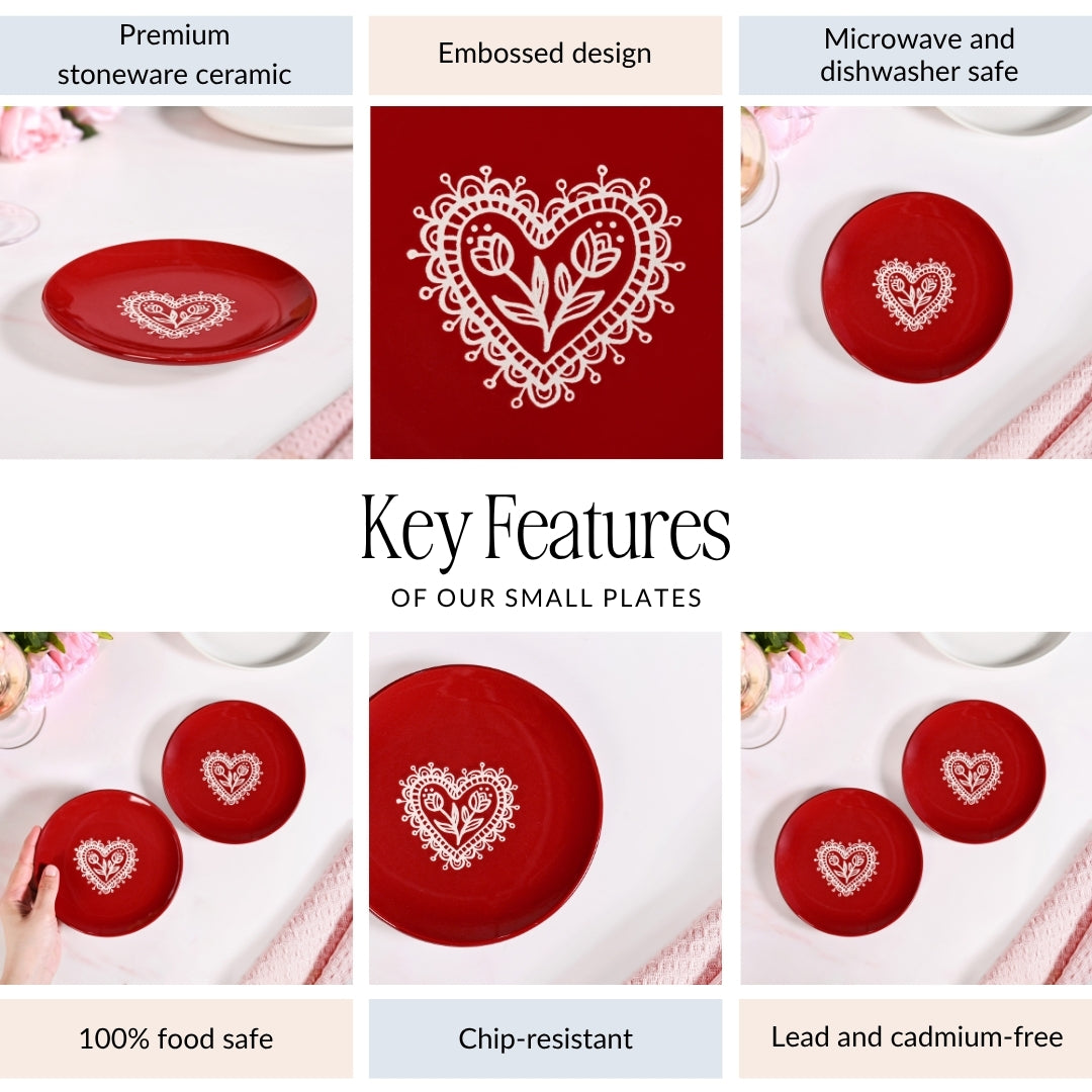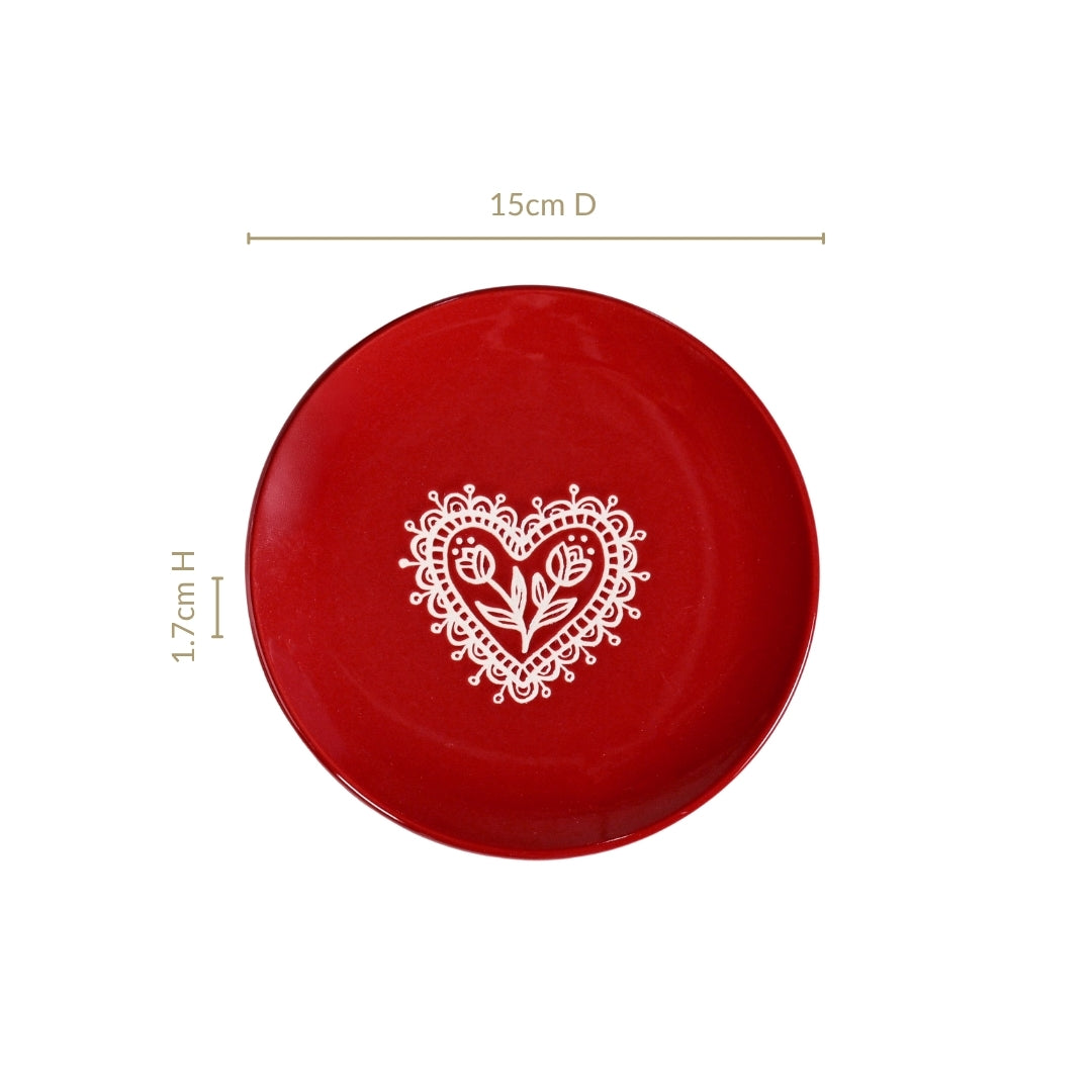 Design: Each plate is beautifully crafted from high-quality stoneware ceramic and finished in a rich, glossy red hue. At the centre, a delicately embossed heart adds a tactile detail that makes the design stand out while staying effortlessly elegant. The smooth glaze gives the plate a subtle sheen, making it easy to clean and long-lasting.