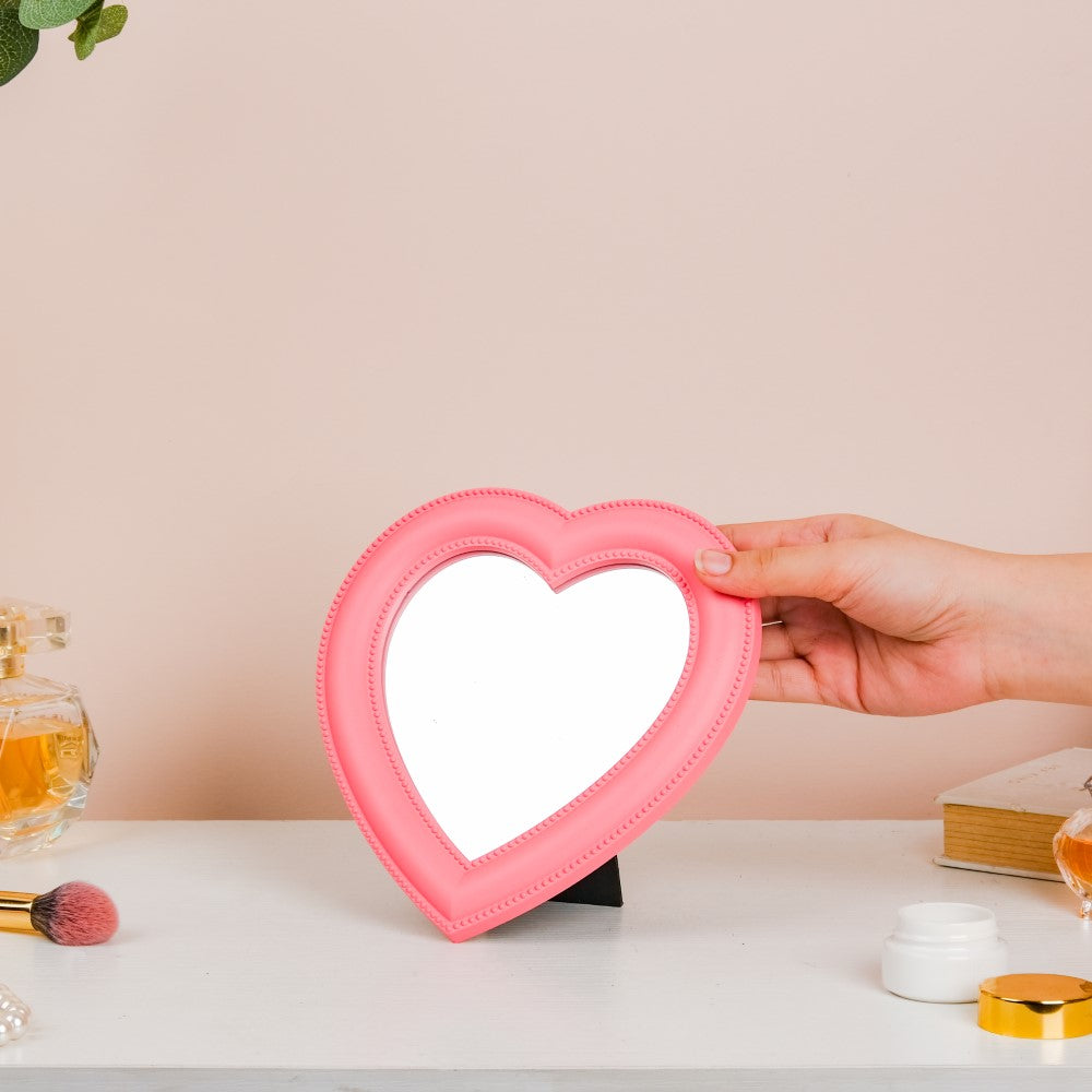 This adorable pink coloured heart-shaped mirror looks great mounted on a wall or placed on the dressing table or shelf. The pastel pink mirror adds a chic and stylish element to the room. The minimalist heart design in a soft pastel tone easily matches any room's color scheme. The mirror is handy enough to fit inside your bag and portable enough to be conveniently carried. Equipped with a high-definition mirror, it is great for doing makeup and styling your hair.