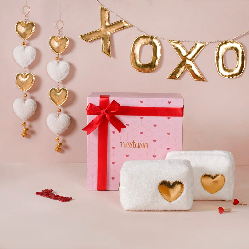 Dive into the spirit of romance with our exquisite Valentine's Day gift hamper set. This captivating gift set features a pair of two pristine white makeup pouches adorned with a radiant golden heart, offering both elegance and functionality. Enhance the ambience with the golden XOXO wall bunting, adding a touch of glamour and cosiness to any space. The charming wall hanging set, adorned with a delightful mix of white and gold hearts, completes the hamper, creating a warm and affectionate atmosphere. Elevate your expressions of love with this carefully curated gift hamper – a blend of sophistication and sentiment that will make this Valentine's Day truly unforgettable.