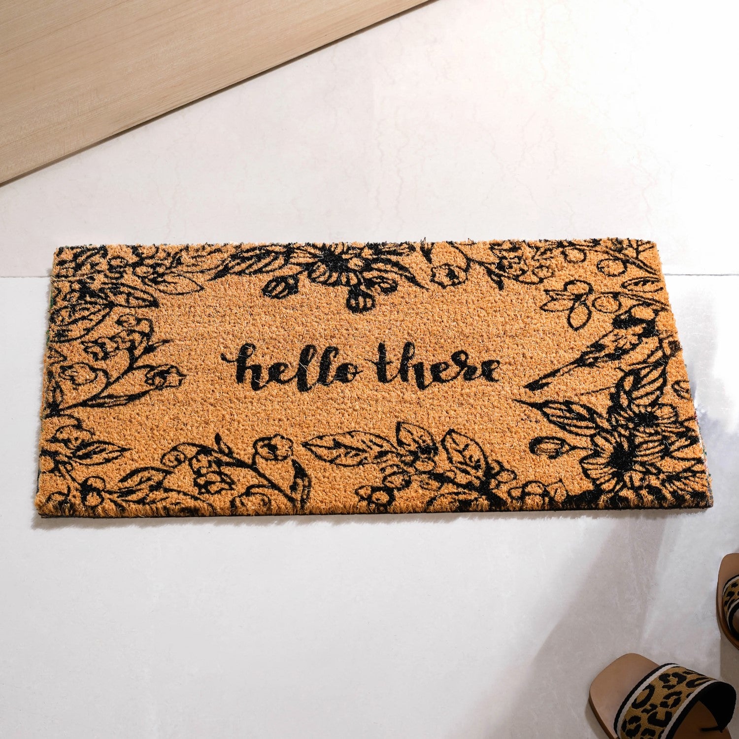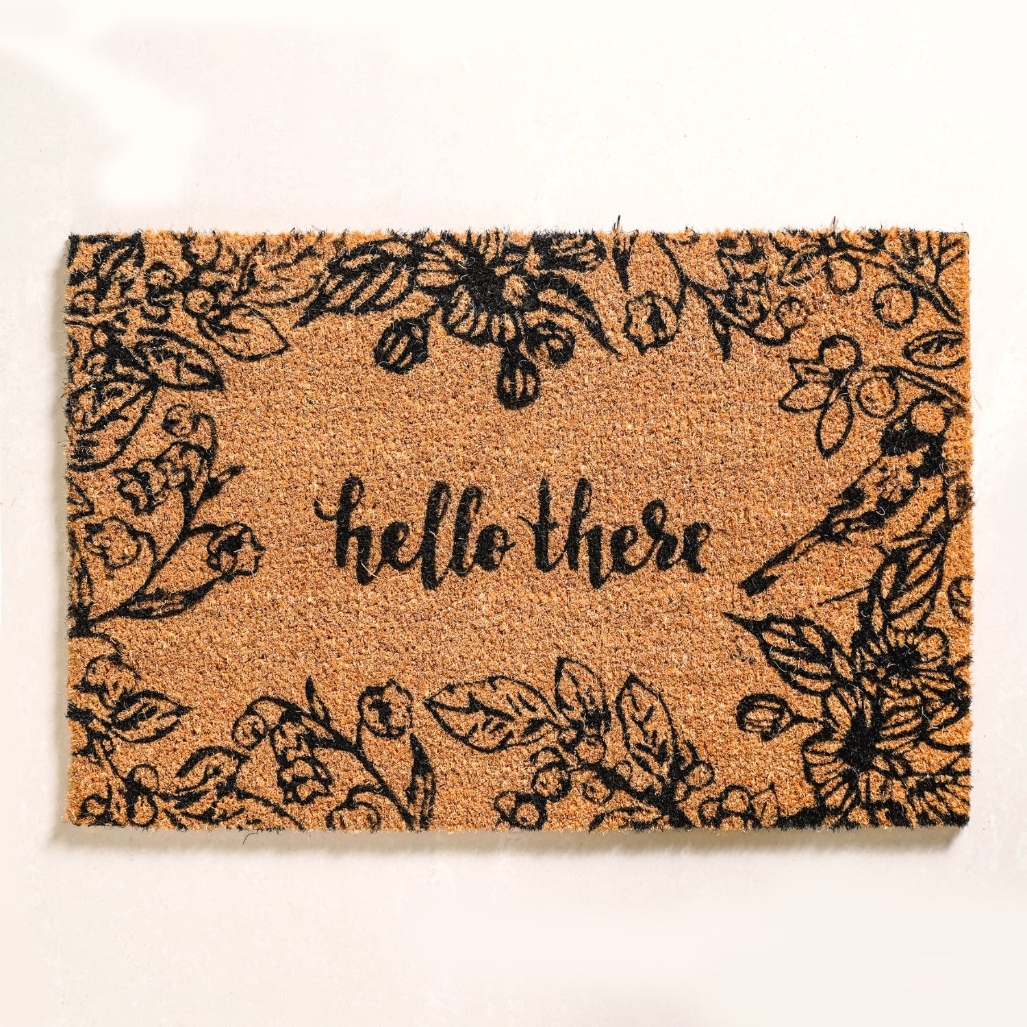 Design: The coir mat features a delightful black leaf and floral print, along with a cheerful "hello there" text, creating a friendly and stylish statement for your entryway. Its neutral beige backdrop complements a variety of decor styles, effortlessly blending in with modern and traditional aesthetics alike.