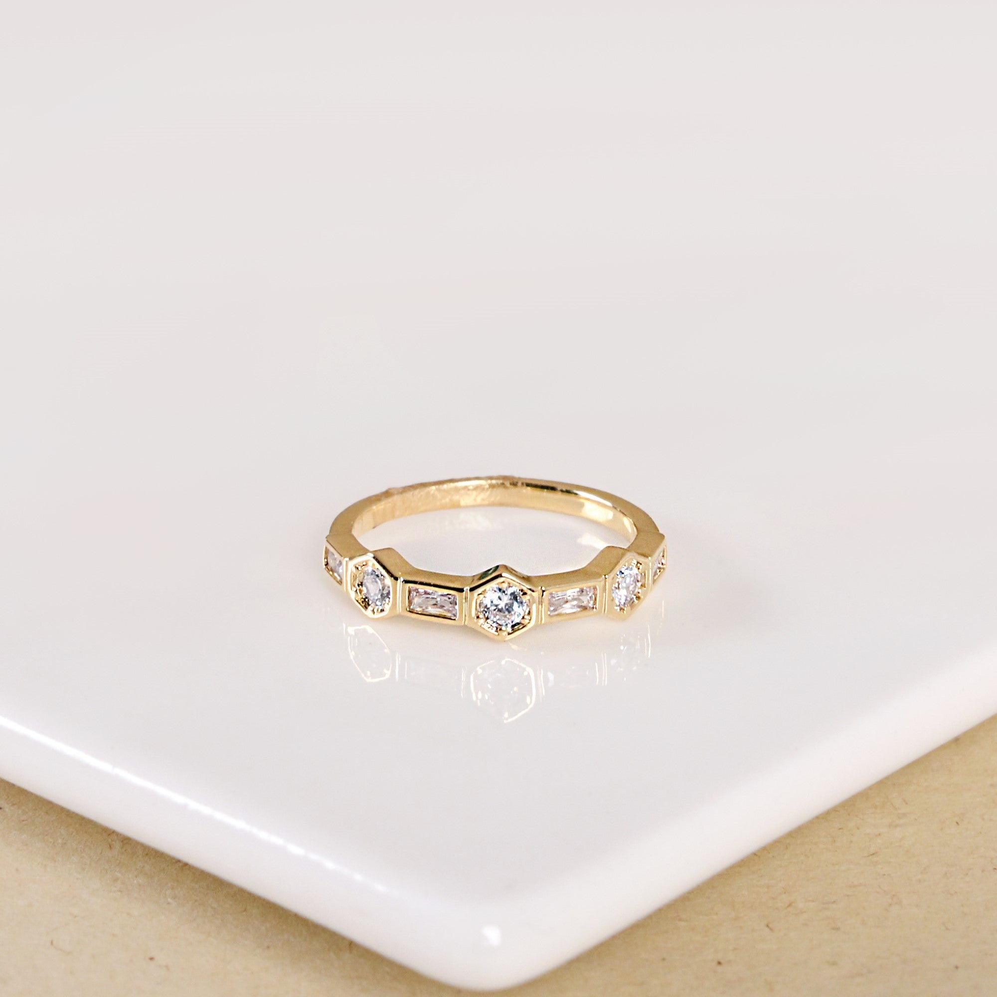 Some rings sparkle, but this one dances with light. Set in a sleek gold-toned band, a stunning lineup of baguette-cut and hexagonal diamonds take turns stealing the show. Their alternating arrangement creates a hypnotic play of shapes, while their iridescent glow catches every flicker of light. Elegant yet unexpected, this ring is made for the ones who love a touch of brilliance with a twist.