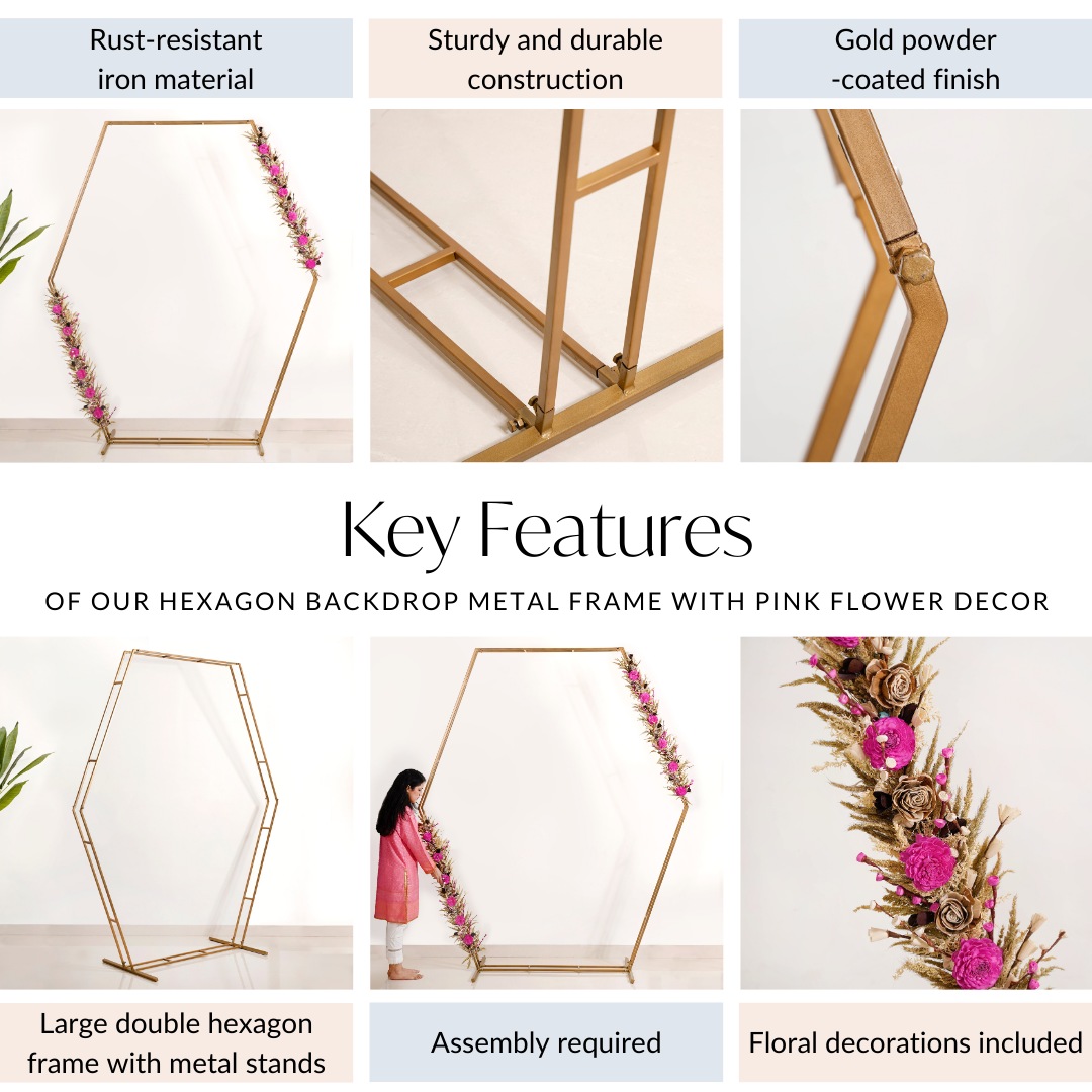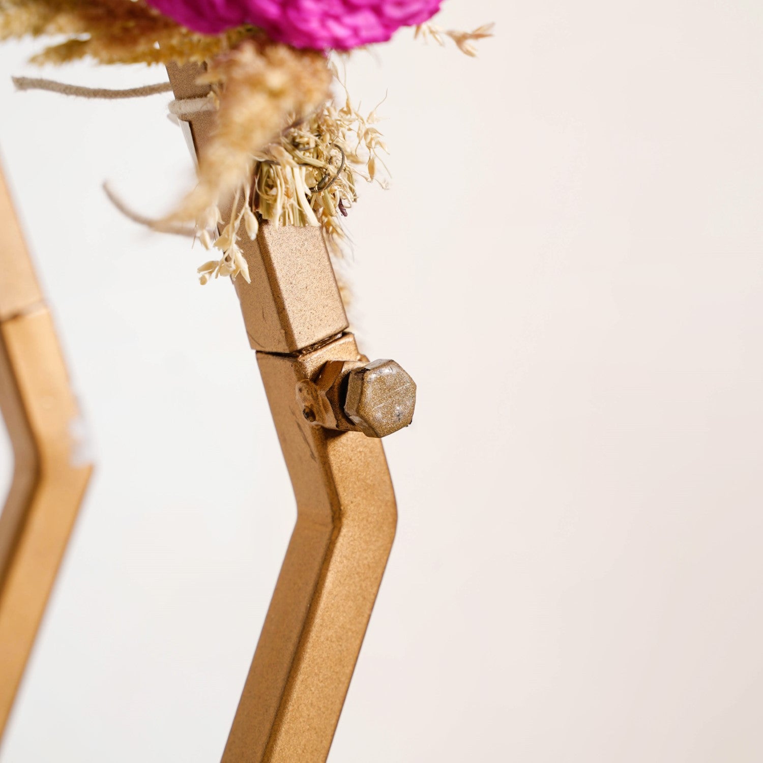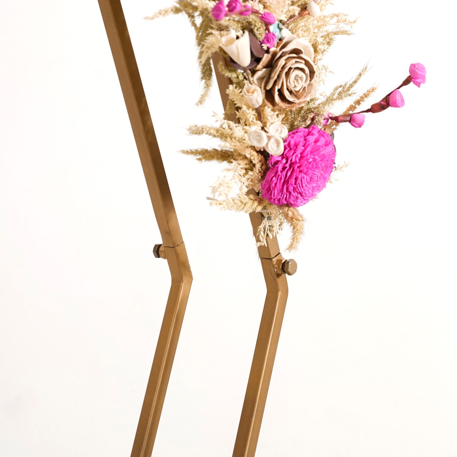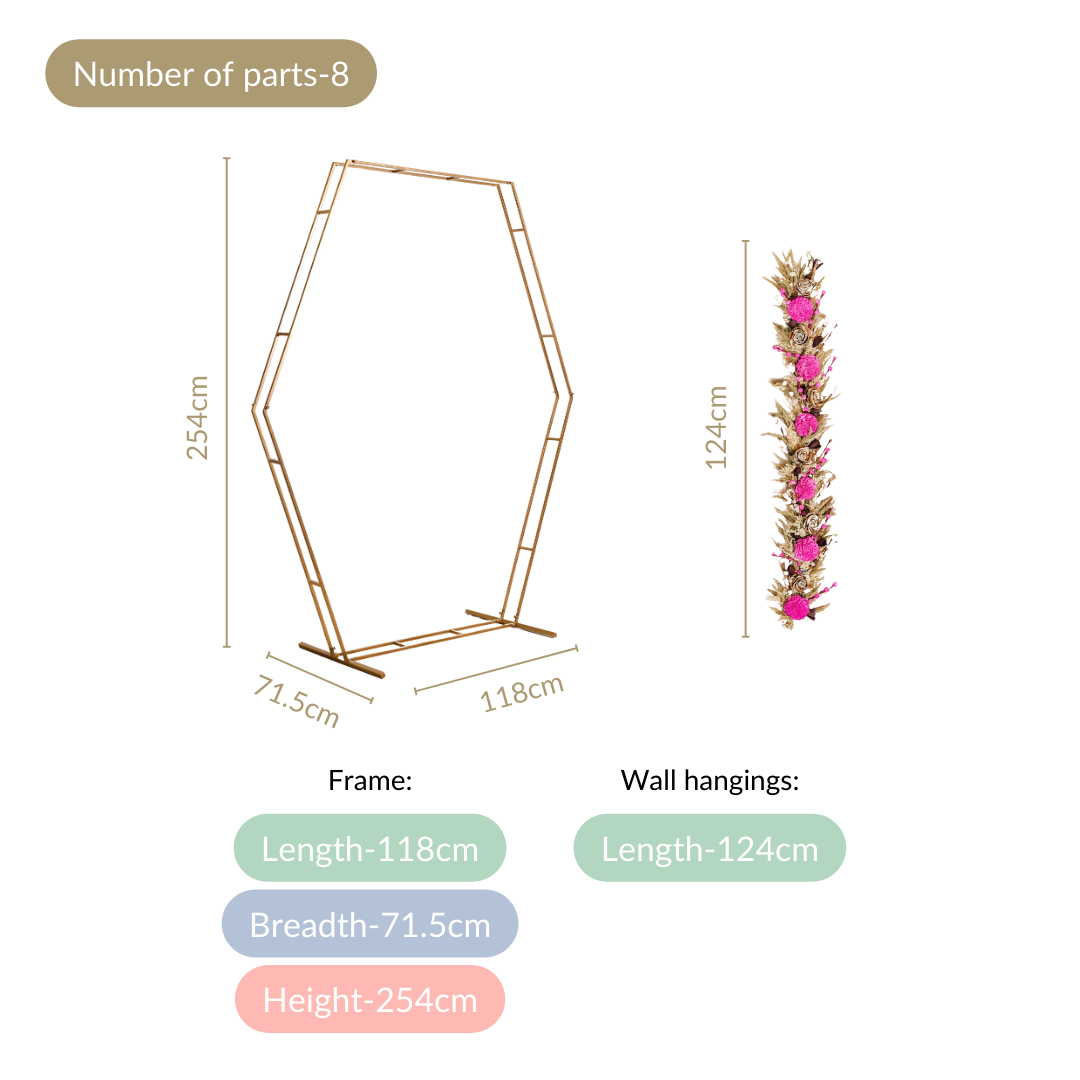 To create a layered look with the double hexagon frame, start by using varying lengths of fabric or garlands draped across different parts of the frame. Place larger floral arrangements at the corners and smaller accents in the centre for depth. You can also hang elements like lanterns, photo frames, or small mirrors at different heights within the hexagons.