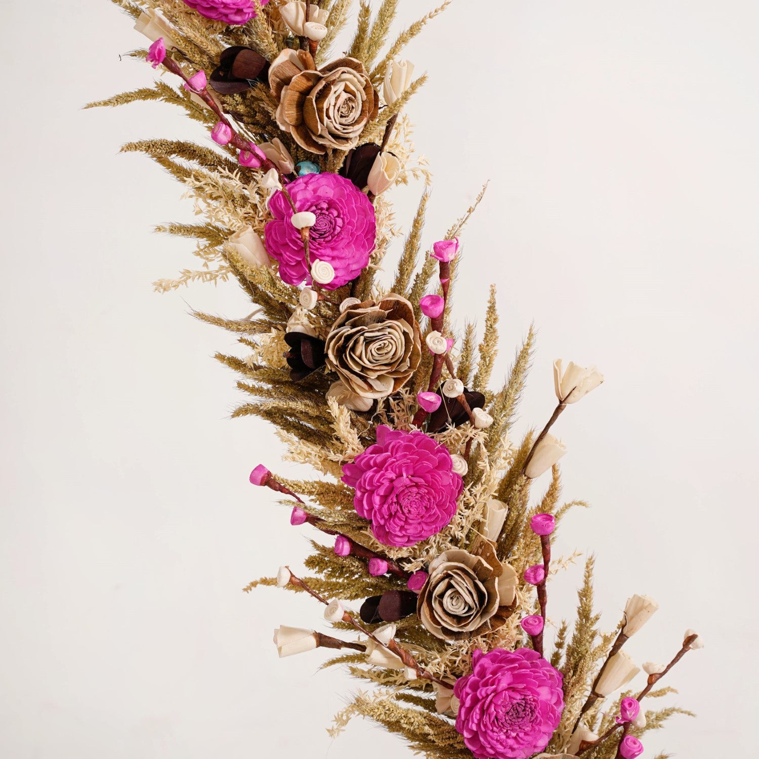 To maintain the floral decorations, keep them away from direct sunlight and high humidity, as these can cause the colours to fade and the materials to deteriorate. Gently dust the decor with a soft brush or a feather duster to remove any accumulated dust. Avoid using water or cleaning sprays, as moisture can damage the natural materials.