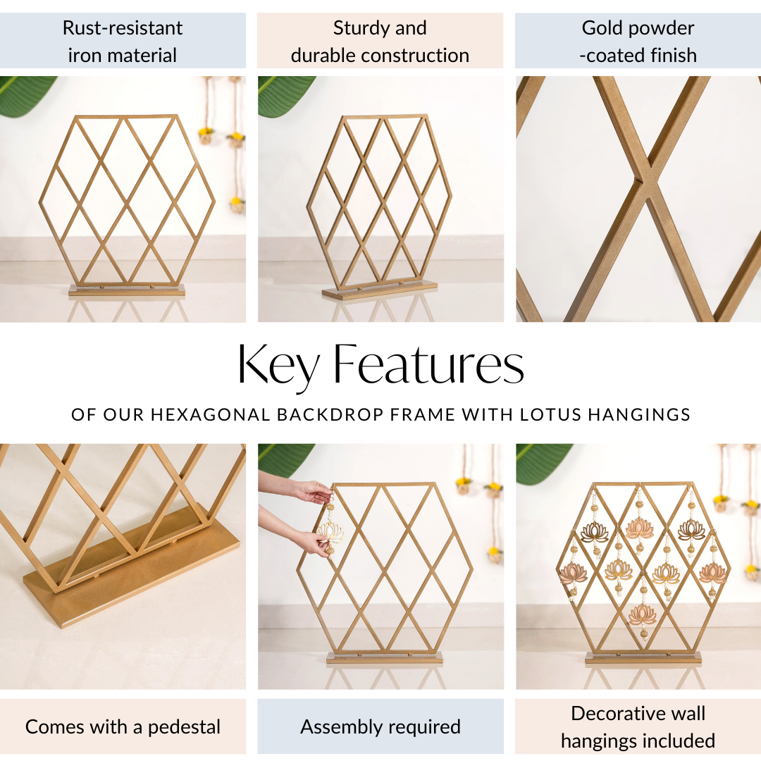 Hexagonal Puja Backdrop Metal Frame With Lotus Hangings 24 Inch