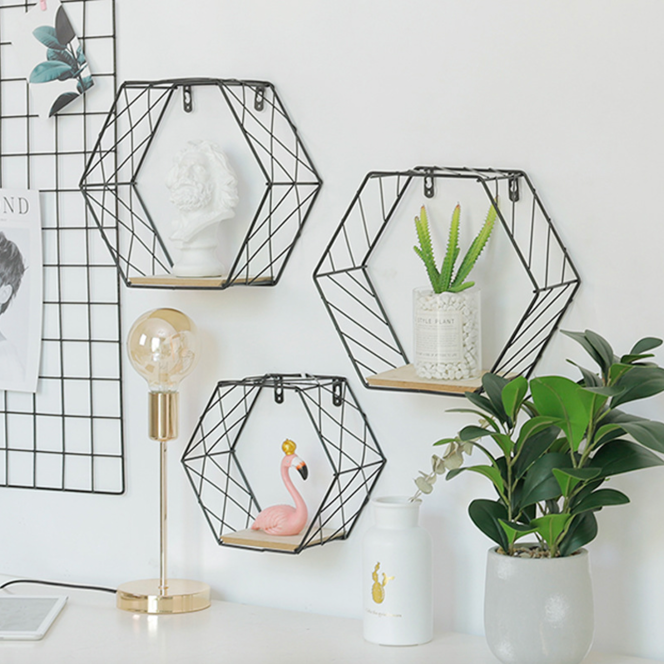Metal wall rack with a distinctive hexagonal construction to accent the bedroom walls. The stylish shelf can be mounted on the wall or placed on a flat surface, and it can hold paintings or mementos of love ones. The souvenirs are kept safe on the black shelf, which has wooden hardwood bases.
