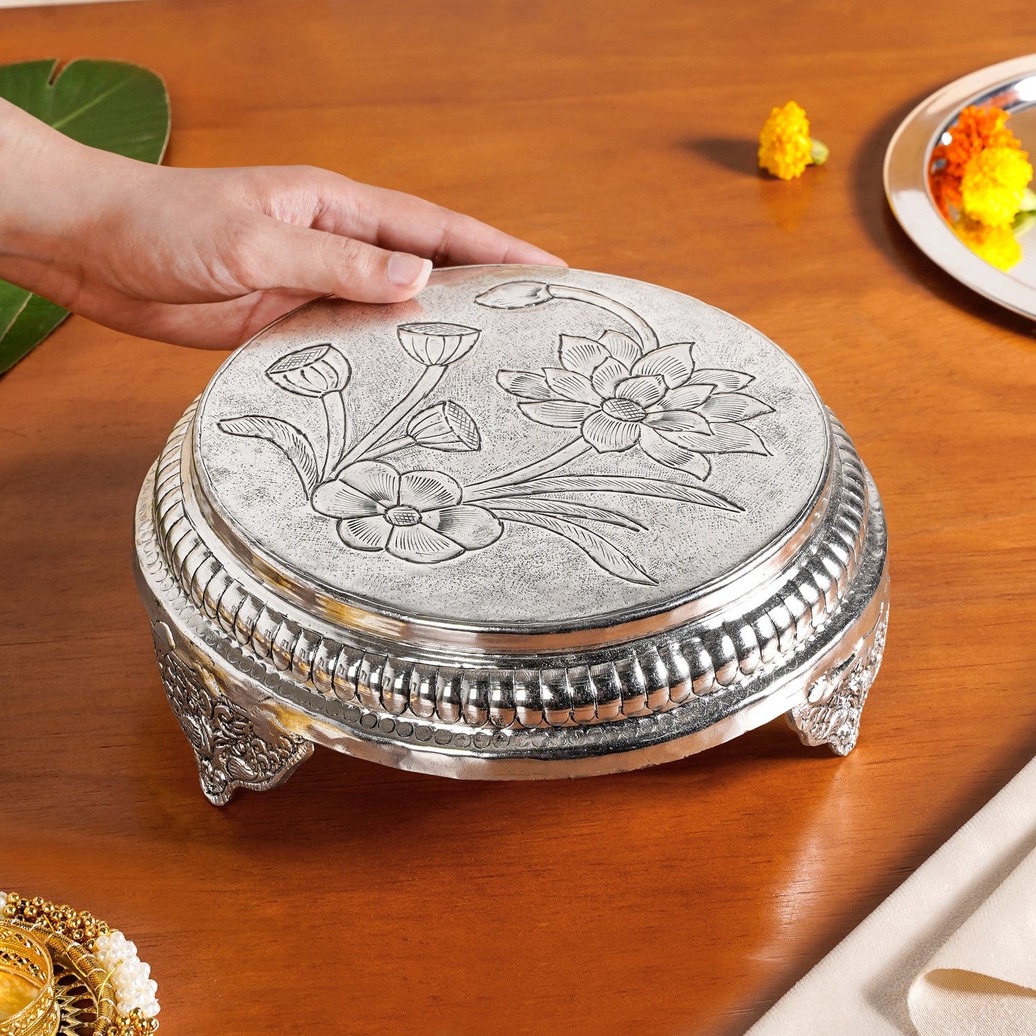 Design: This pure brass with silver polish chowki is crafted in a circular form that reflects traditional Indian artistry with fine craftsmanship. The top surface is decorated with embossed floral carvings surrounded by engraved borders and patterned detailing. Resting on short decorative pedestal legs, the structure remains stable for puja essentials. Its smooth, polished finish provides a subtle shine while the compact size makes it suitable for any altar.