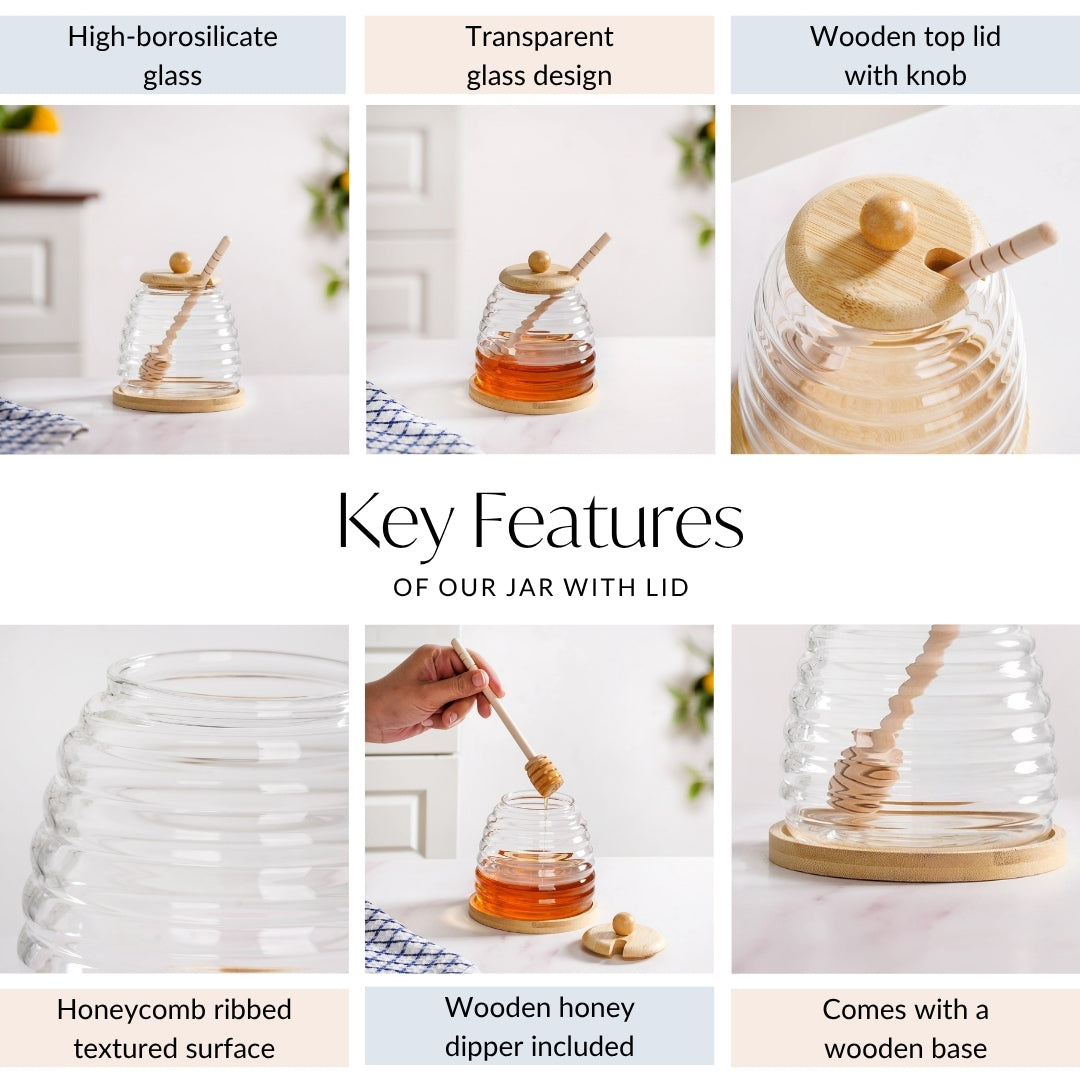 Design: Crafted from high-borosilicate glass, its transparent glass design beautifully showcases the rich, amber glow of your honey, turning it into an inviting display. The pot's distinctive honeycomb ribbed textured surface isn't just visually appealing; it subtly echoes the natural source of honey, adding a delightful tactile element. It's elegantly crowned with a smooth wooden top lid, complete with a matching wooden knob that adds an organic, artisanal touch. Nestled within is a perfectly sized wooden honey dipper, designed for effortless, mess-free serving. The pot comes with a coordinating wooden base, ensuring stability and creating a cohesive presentation.