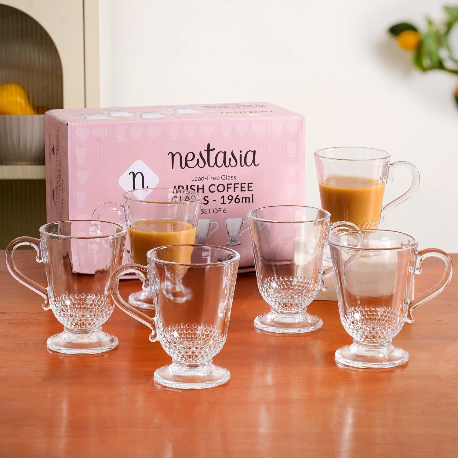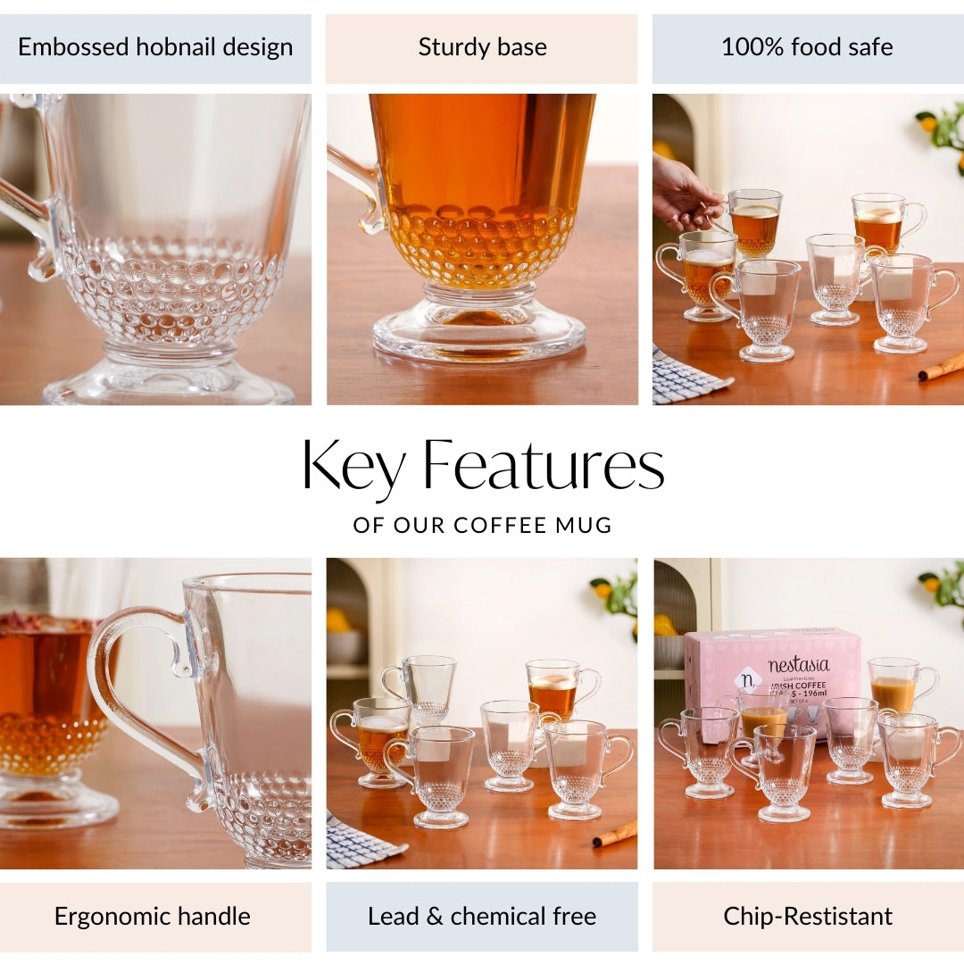 Design: This set of Irish coffee glasses features a distinctive hobnail pattern circling the cup just above the pedestal, adding texture and visual interest. Crafted from premium, transparent glass, each piece is lightweight yet durable, with a sturdy pedestal base and an ergonomic glass handle. The refined curves combined with the textured detailing create a modern twist on classic coffee glassware, making them a sophisticated addition to any table. In addition to that, it comes in a beautifully pre-packed box, all ready for gifting!