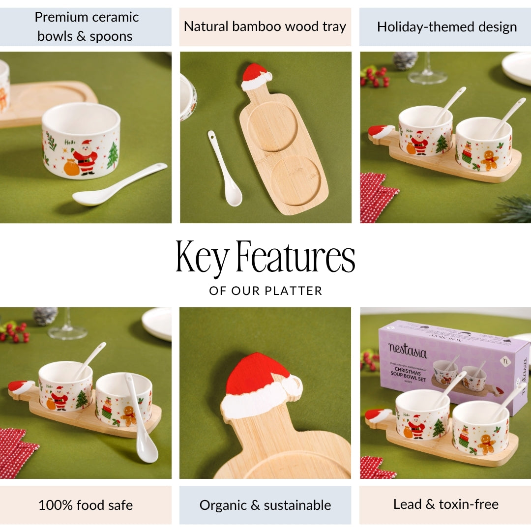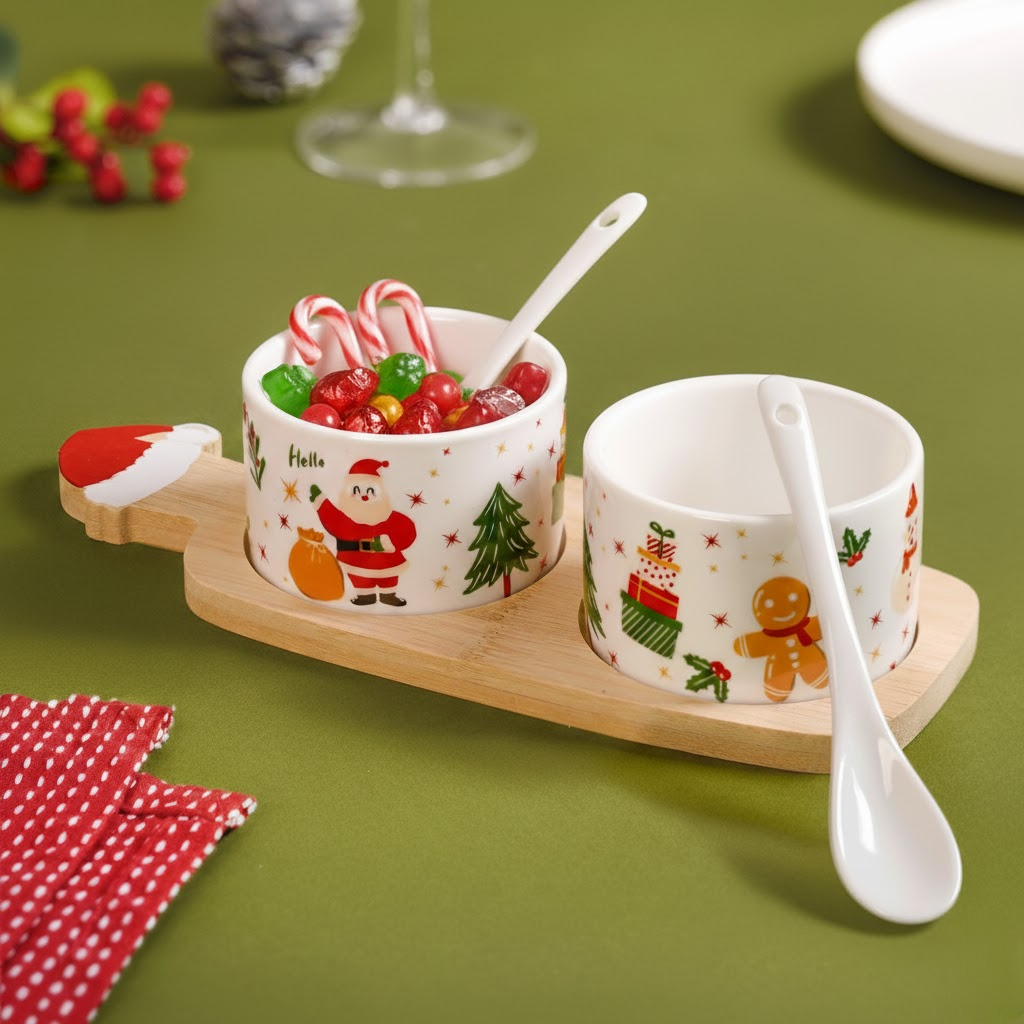 Design: Each soup bowl features delightful holiday-themed prints that make mealtime more joyful. Perfect as a soup bowl set for serving hearty soups, broths, or snacks, it blends charm with practicality. The set includes two ceramic bowls with matching spoons and a wooden tray, ideal for winter dinners or gifting. Each bowl showcases cheerful Christmas-themed designs, Santa, candy canes, and festive gifts in classic red, white, and green tones, bringing a playful spirit to your table. Finished with a Santa-hat-shaped tray handle, this ceramic bowl set makes every serving look as festive as the season itself.