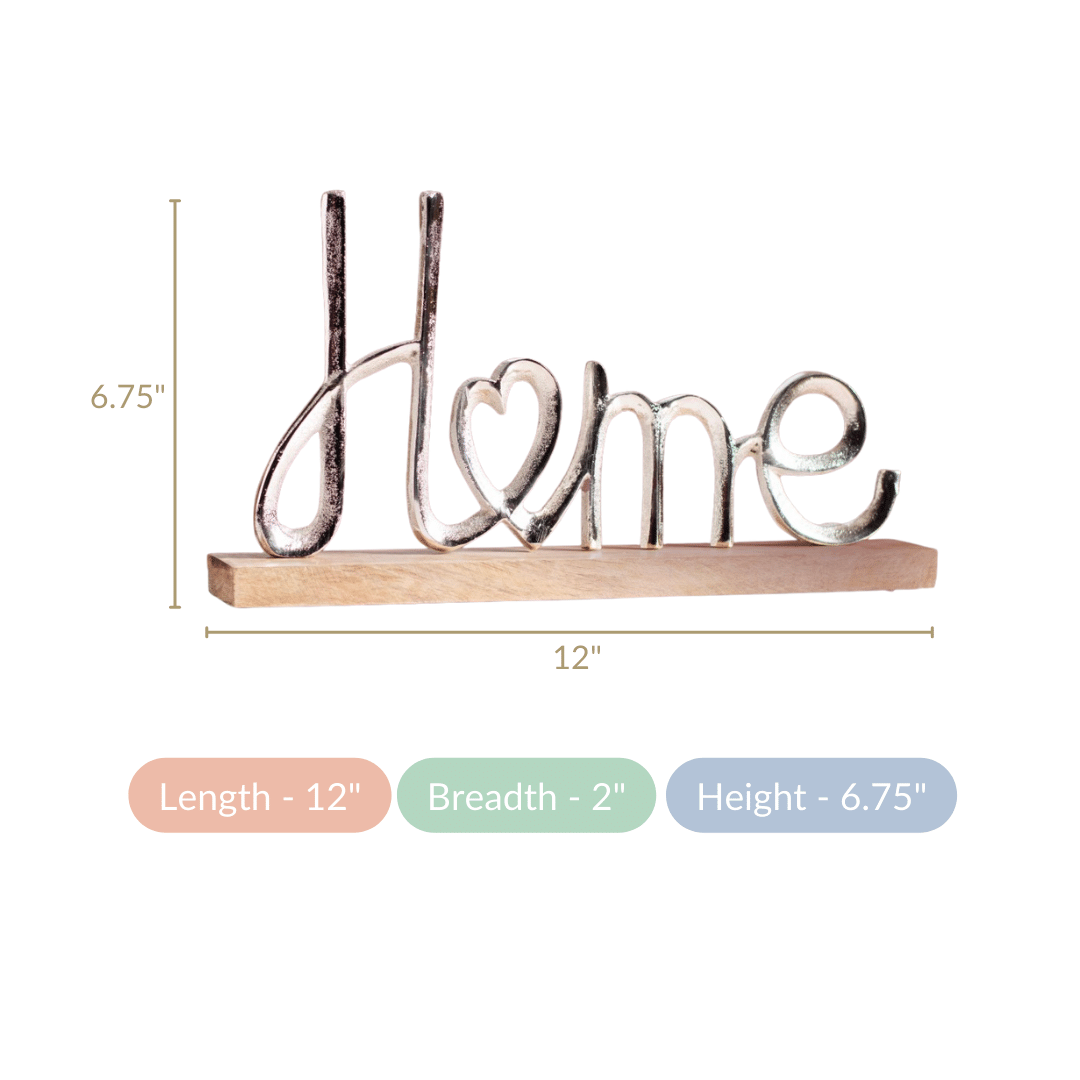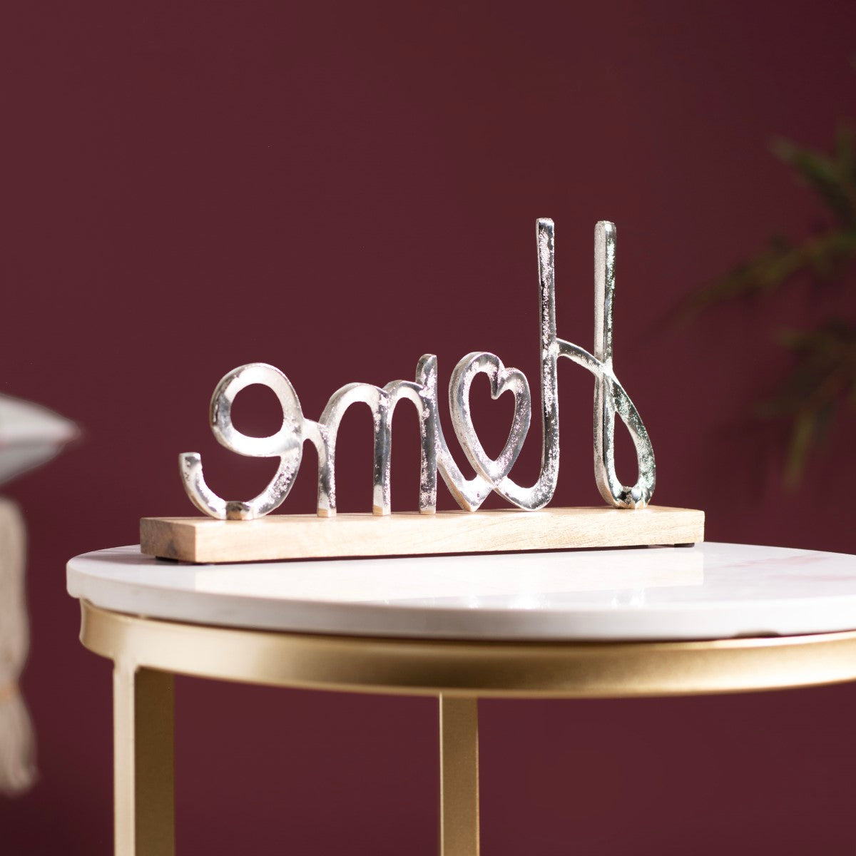 This showpiece stands out due to its thoughtful design. The "Home" typography with a heart-shaped "o" symbolizes the warmth and comfort of home. Crafted from premium aluminium, its high-sheen silver finish adds elegance, while the sturdy mango wood base ensures durability.