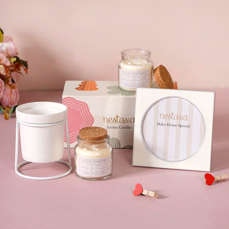 Spread love with our exquisite Valentine's gift hamper set! Cherish special moments in the elegant white square photo frame, capturing timeless memories. Bring nature indoors with the stylish indoor planter featuring a sleek metal stand, perfect for nurturing a symbol of your growing love. Set the mood with the set of two clove-scented soy wax candle jars, creating a warm and romantic ambience. This thoughtfully curated gift set is a celebration of love, blending aesthetics and sensory delights. Elevate your Valentine's Day with this unique gift hamper, a token of affection that will be cherished for years to come.