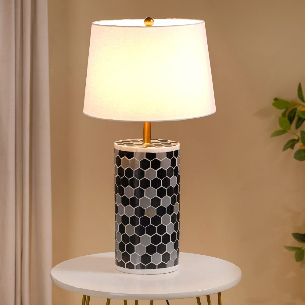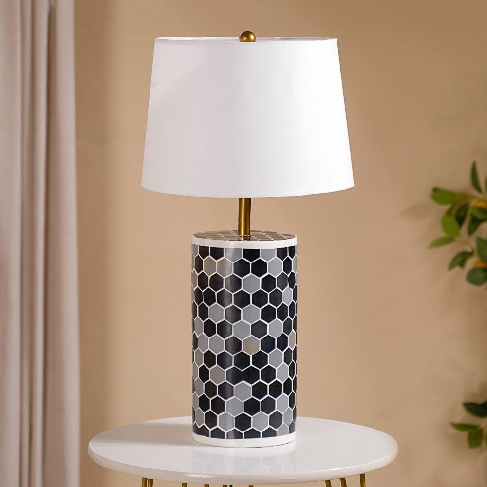 Our gorgeous table lamp is a true testament to craftsmanship and elegance. This lamp boasts a sturdy wooden structure, meticulously designed to withstand the test of time. Its smooth resin finish adds a touch of sophistication, while the captivating honeycomb design in black, white, and grey exudes contemporary charm. The metal lamp holder with its high-sheen gold finish effortlessly complements the overall aesthetic. Rest assured, the lamp is not just visually appealing but also built with high-quality electrical wiring, ensuring a safe and reliable lighting experience. Enhance your living space with this exceptional piece that combines artistry, durability, and practicality.