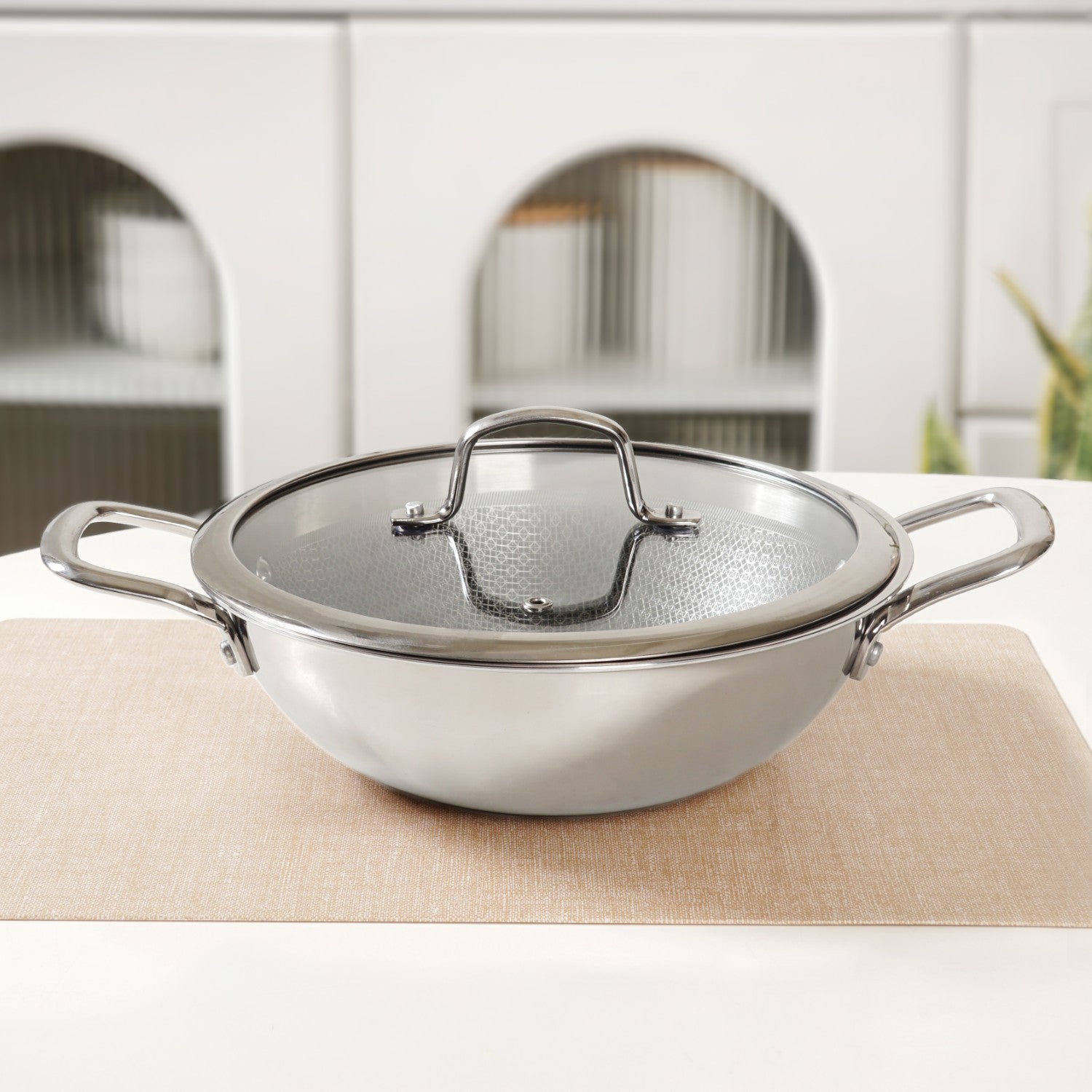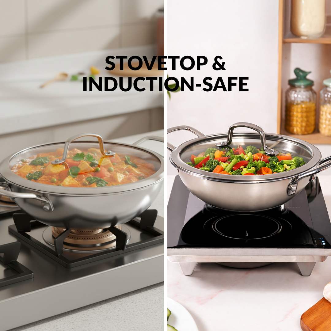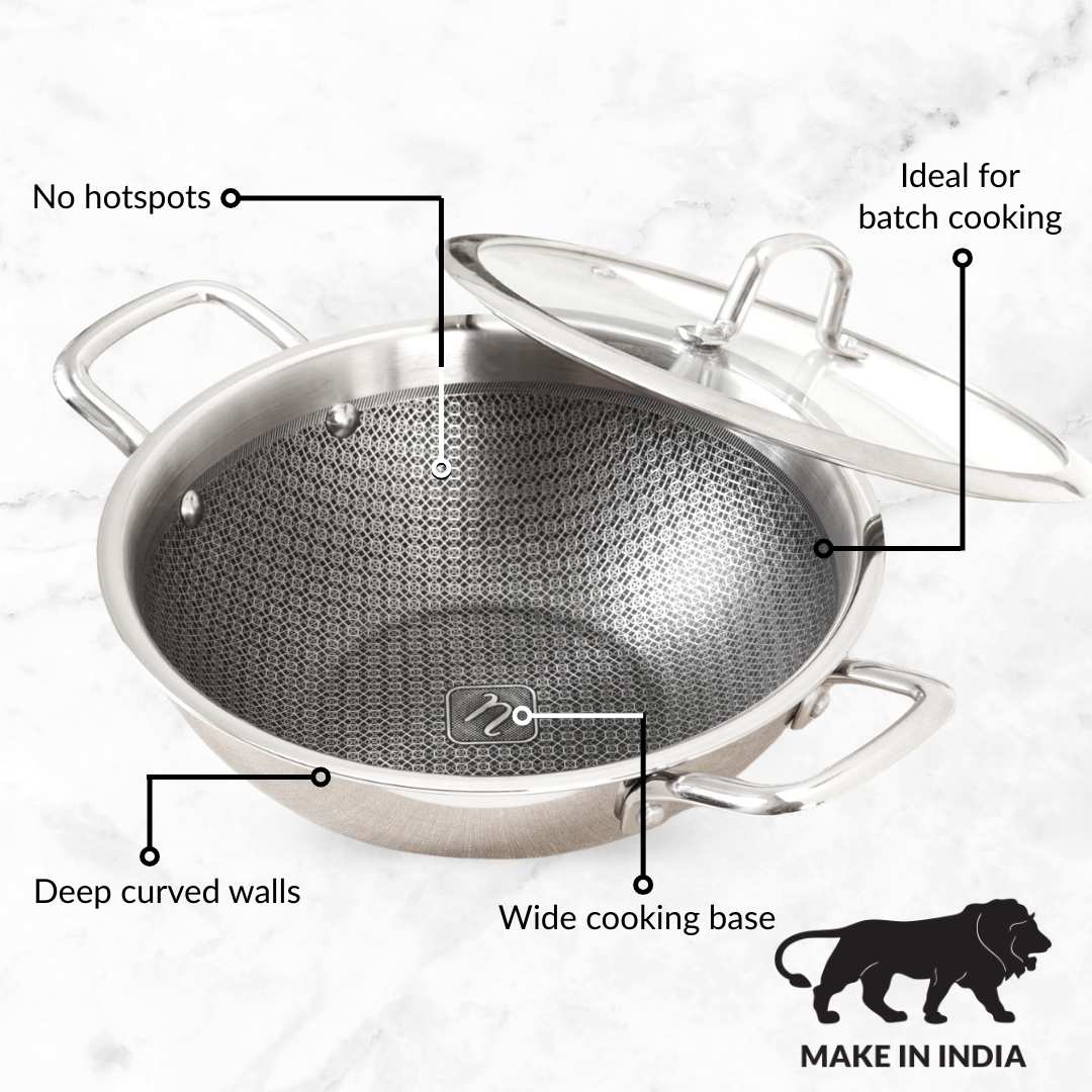 Benefit: The tri-ply construction eliminates hot spots, ensuring evenly cooked meals every time. Its food-safe, non-reactive surface maintains the true taste of ingredients. The honeycomb non-stick layer requires less oil while allowing the use of steel ladles without damage. Ideal for frying, sautéing, simmering, and slow cooking, this kadai supports versatile cooking styles while remaining easy to clean and maintain.