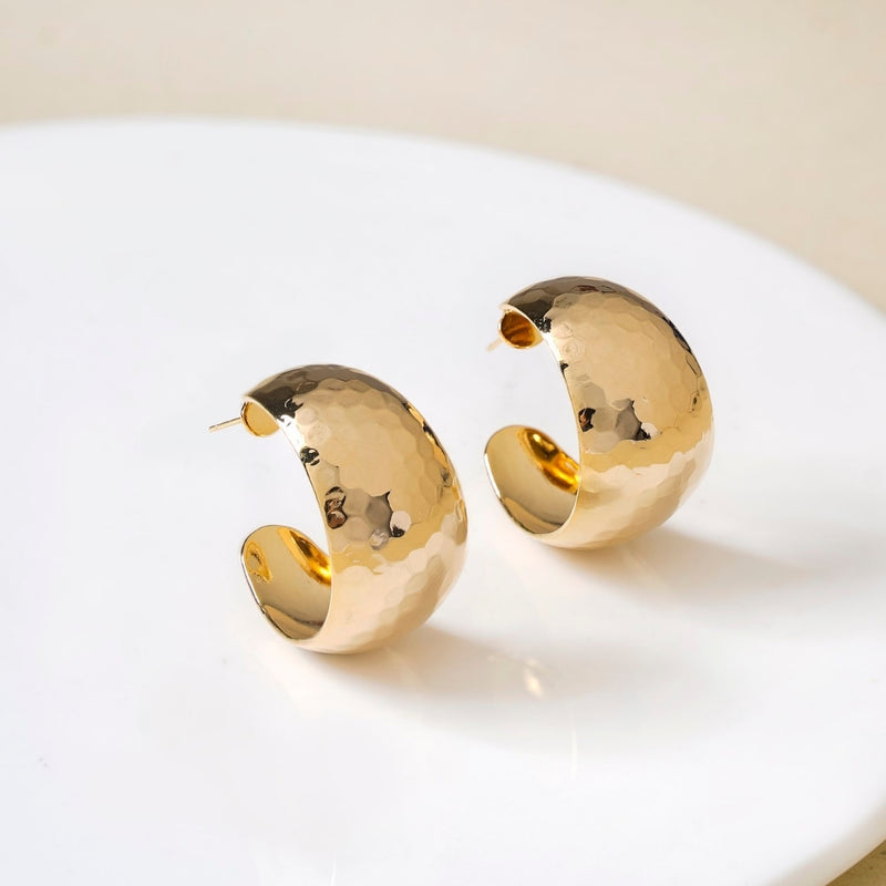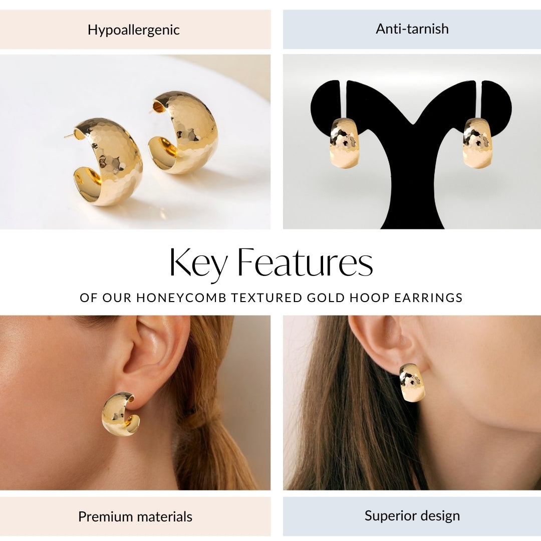 Add a touch of nature's geometry to your look with these striking gold-toned hoop earrings, featuring a bold honeycomb textured design. The intricate pattern, inspired by the perfect symmetry of honeycombs, creates a modern and sophisticated vibe. Lightweight yet eye-catching, these hoops effortlessly blend elegance with a contemporary flair, making them perfect for both casual and formal occasions. With their polished finish and unique texture, these earrings are sure to be a standout piece in your jewellery collection.