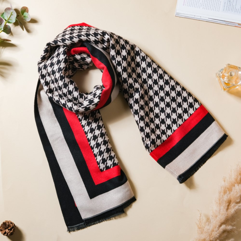 The blanket houndstooth scarf adds a unique fashionable twist to the all-time classic monochromatic colour combination with its wide border design featuring a splash of vibrant red, alongside black and white. The abstract monochromatic patterns also add to the fashion quotient of the winter scarf. Wear the ladies' scarf with neutral or bold colours, including black, red, or beige, for a classy and elegant look.