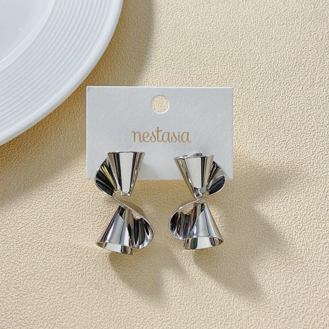 In a perfect fusion of fate and craftsmanship, these silver hourglass earrings embody a blend of industrial nuances and refined elegance. The design is inspired by the timeless form of an hourglass, with smooth, tactile curves that twist gracefully to form a striking silhouette. The silver metal flows seamlessly, with the top and bottom converging into delicate cones, enhancing the earrings' sleek and modern appeal. Ideal for elevating both casual and formal looks, these earrings are a sophisticated statement of contemporary style.