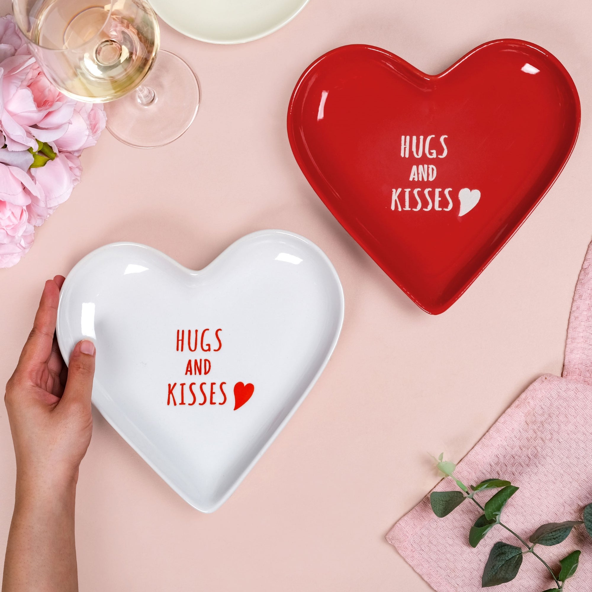 Design: This set includes two heart-shaped plates crafted from premium stoneware ceramic, featuring a subtly embossed text saying "hugs and kisses" that enhances their visual appeal. The red and white colour pairing creates a playful yet elegant aesthetic, perfect for date nights, festive setups, or everyday snacking. Their gently curved silhouette and raised edges keep food in place neatly.