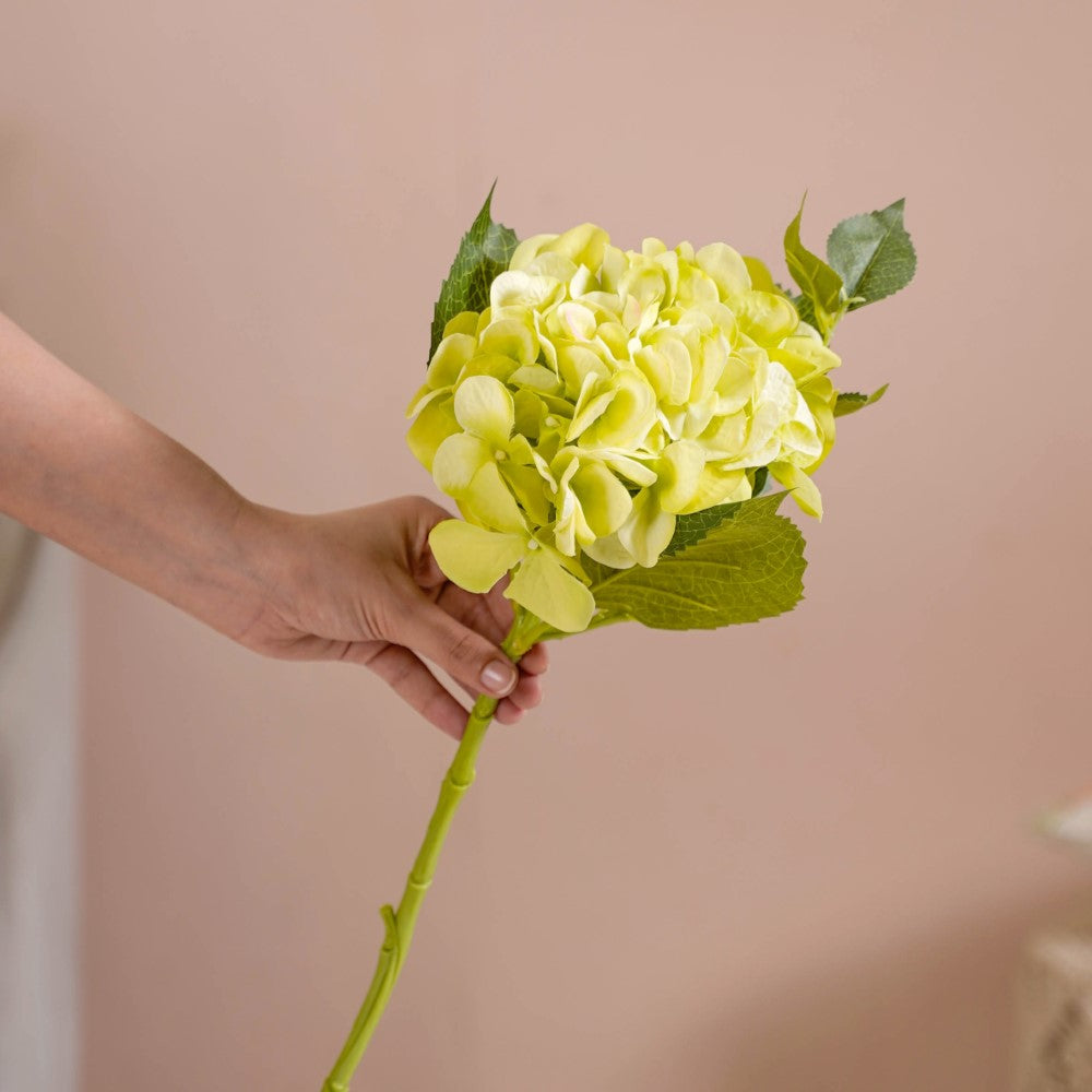 Hydrangeas with leaves are artificial flowers with buds and leaves that give them the look of a fresh hydrangea. Small textures on the stem of the flower give a natural look of thorns which can be escalated by spraying aromatic oils or perfumes to add some fragrance and replace potpourri with fragrant flowers. The artificial green hydrangeas can be paired with dry flowers to elevate the look of any balcony or terrace garden.