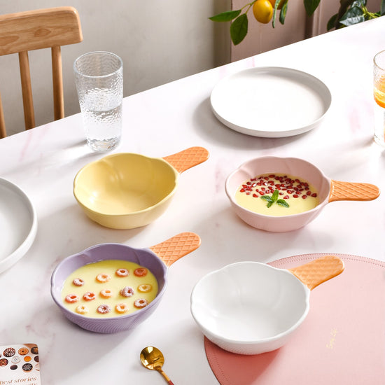 The floral shape of this ceramic bowl is what makes it unique and distinctive. The distinct shape enhances the bowl's aesthetic appeal, making it a charming addition to your table setting or kitchen decor. It can be used for a variety of purposes, such as serving food, snacks, or desserts. Despite its unique shape, the bowl remains highly functional, and the handle adds a practical element for easy grip and handling.