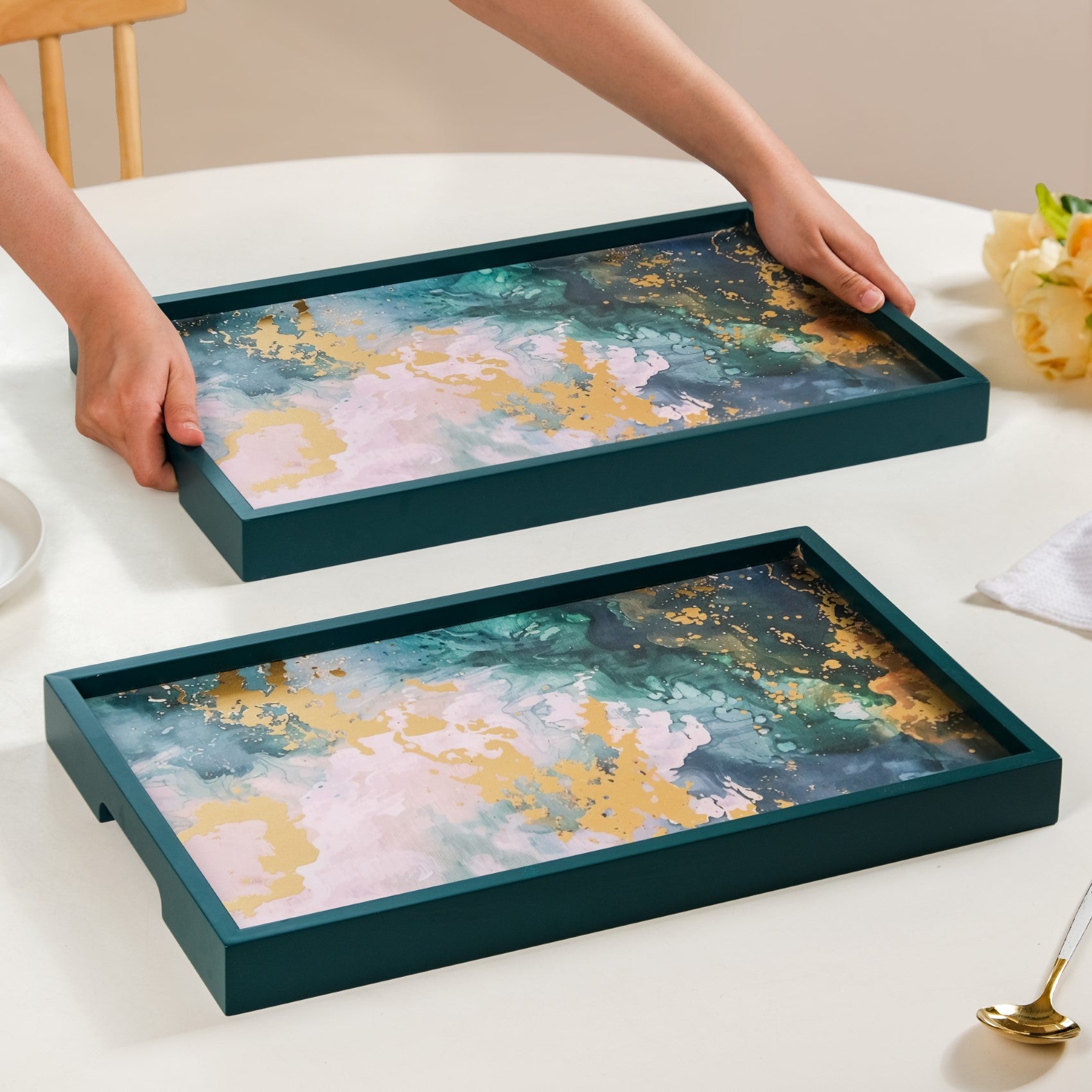 Impressionism Sky Art Tray Set Of 2 Teal Matte Gold